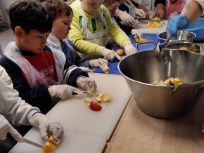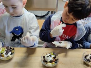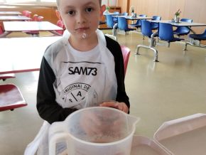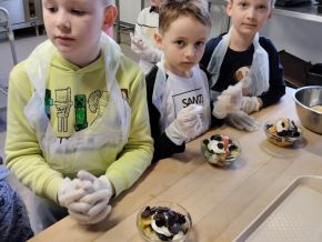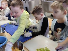 28. března se 4. a 8. oddělení ŠD zúčastnilo projektu Máme rádi jídlo. Ve školní kuchyni, za pomoci profesionálních kuchařek, jsme si připravili ovocný salát. Nakrájeli jsme ovoce, ozdobili ho šlehačkou a posypali čokoládovými křupinkami. Na závěr jsme si moc pochutnali.