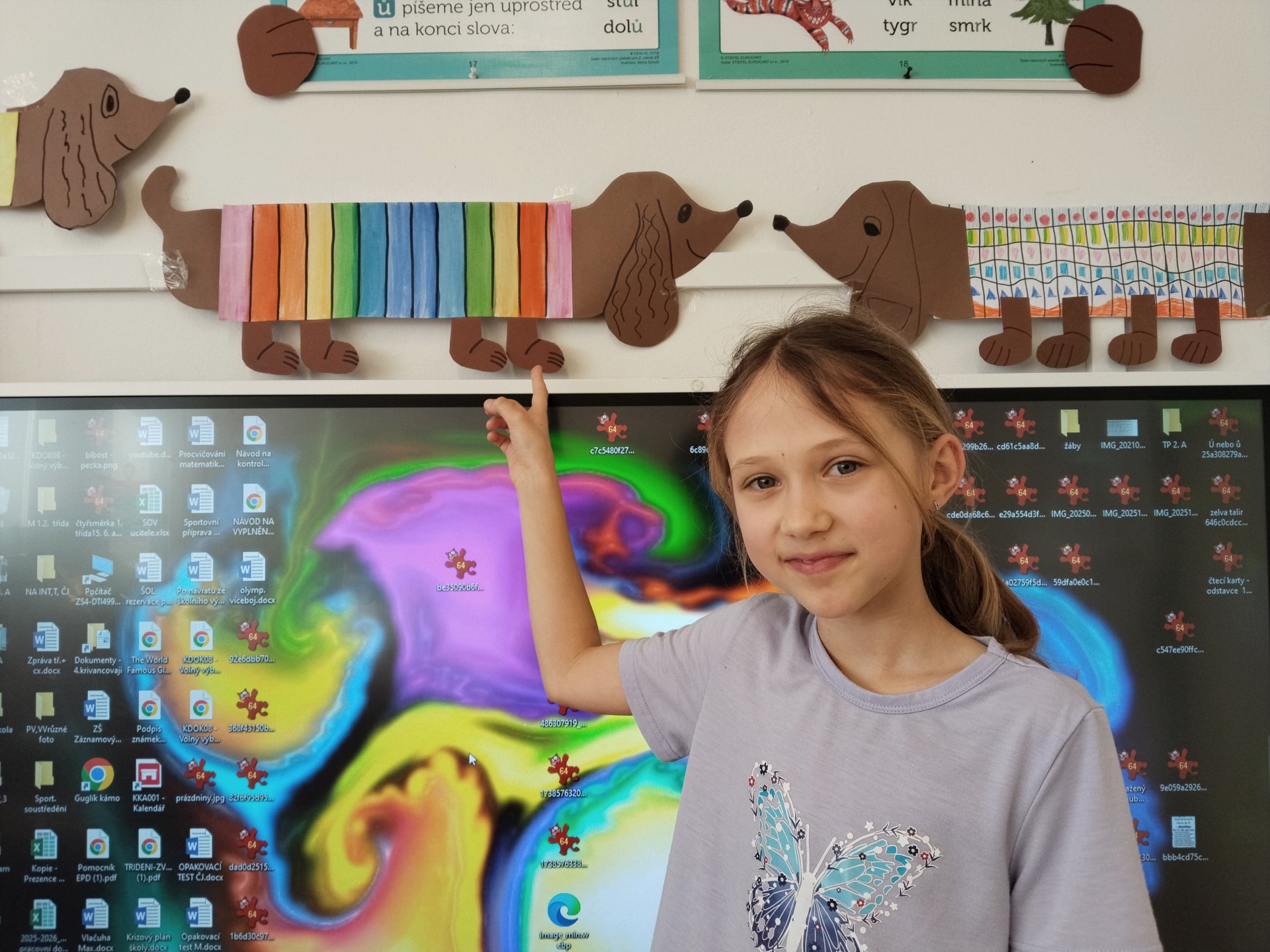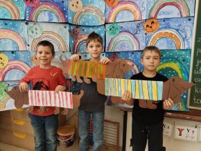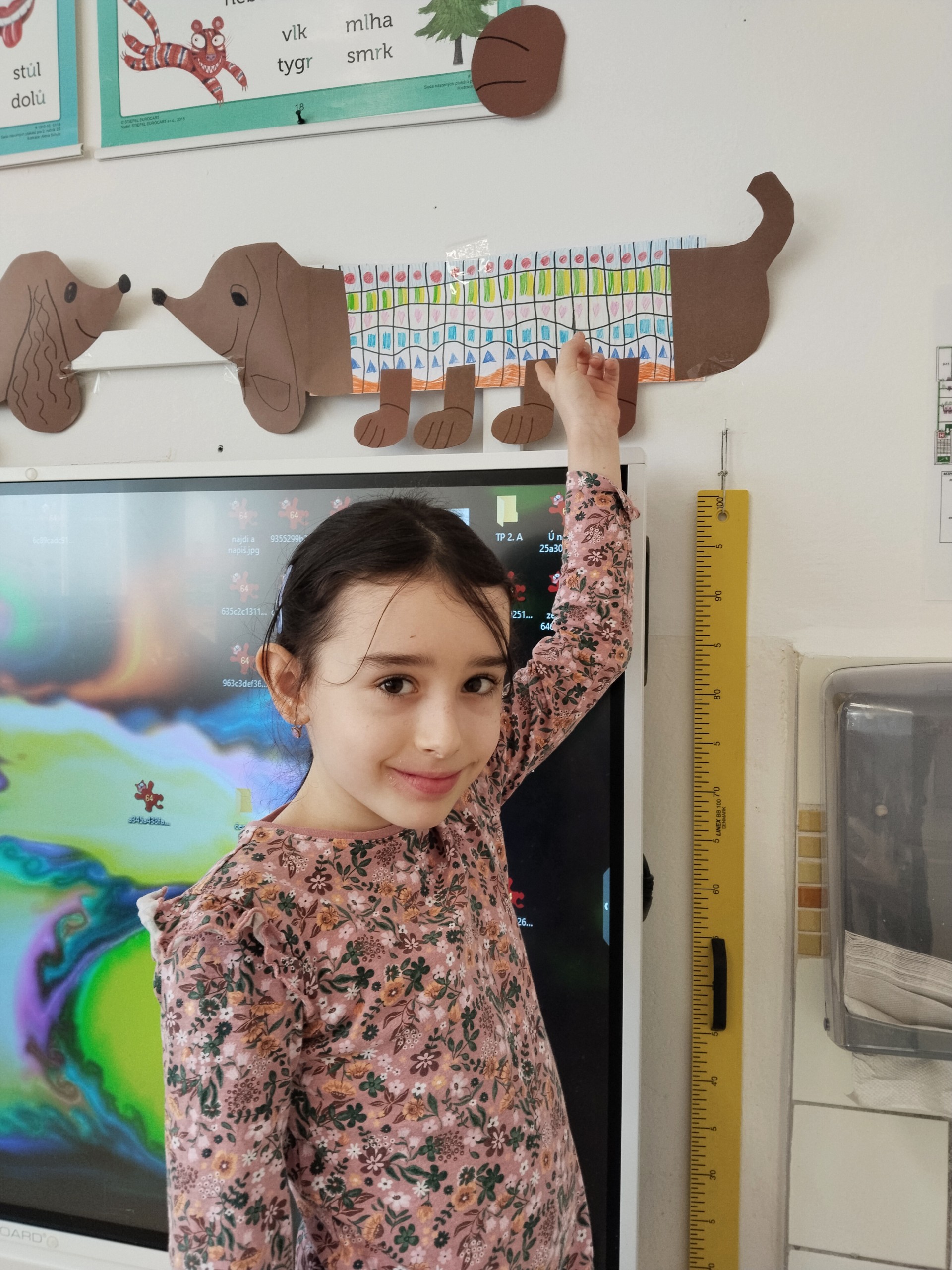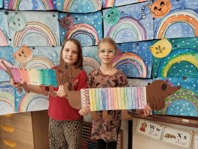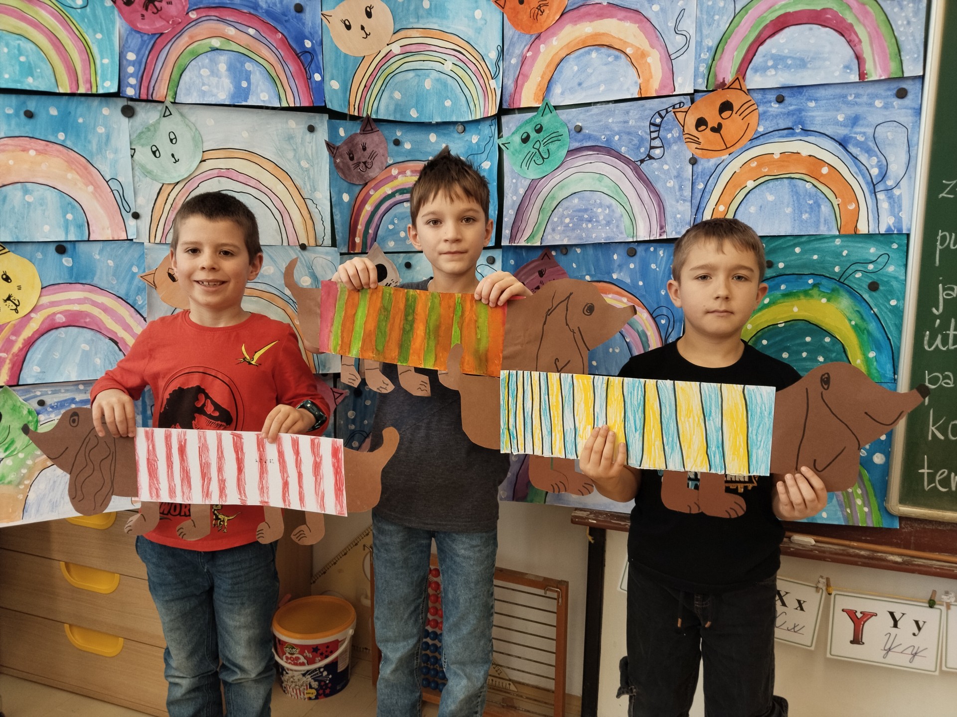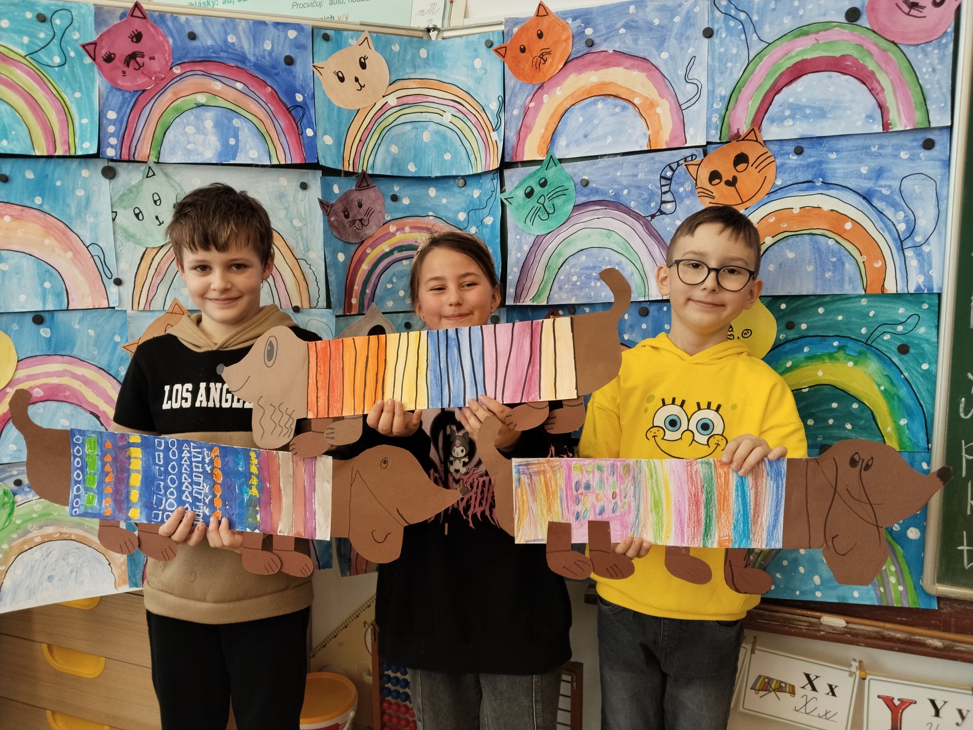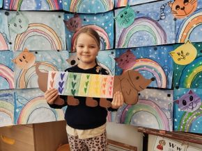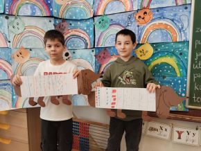 V lednu jsme si namalovali jezevčíky v zimních svetrech, zasněžené kočky a sněhuláky. Také jsme si vytvořili myšky s tvrdými a měkkými souhláskami.