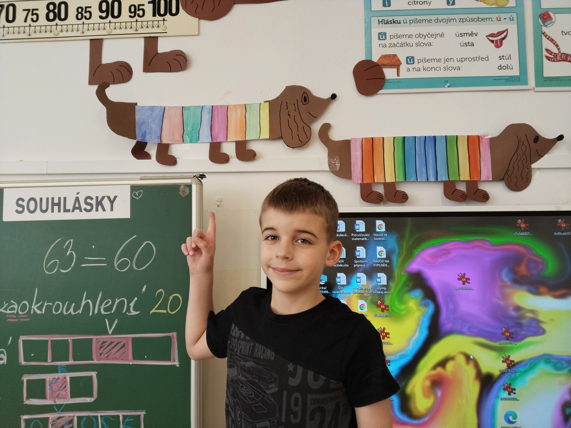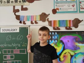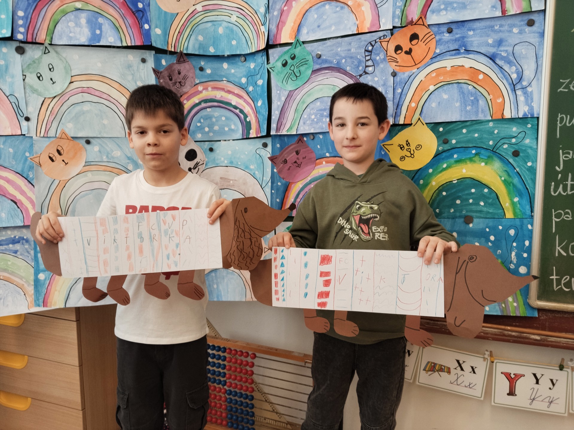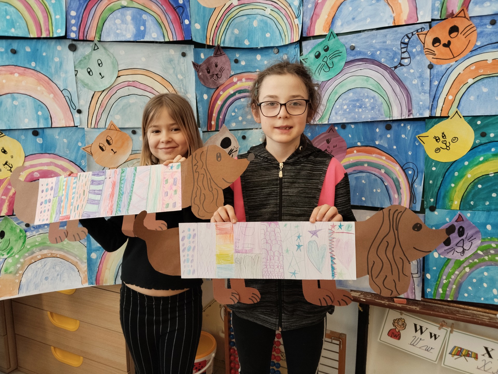 V lednu jsme si namalovali jezevčíky v zimních svetrech, zasněžené kočky a sněhuláky. Také jsme si vytvořili myšky s tvrdými a měkkými souhláskami.