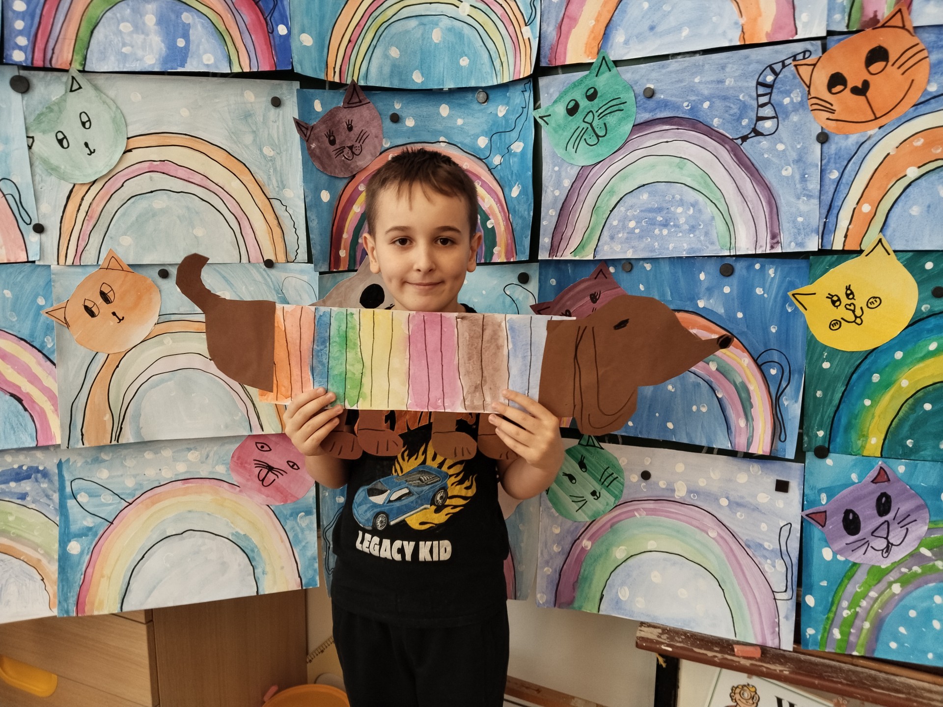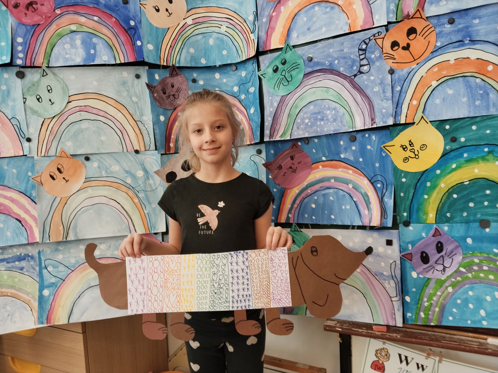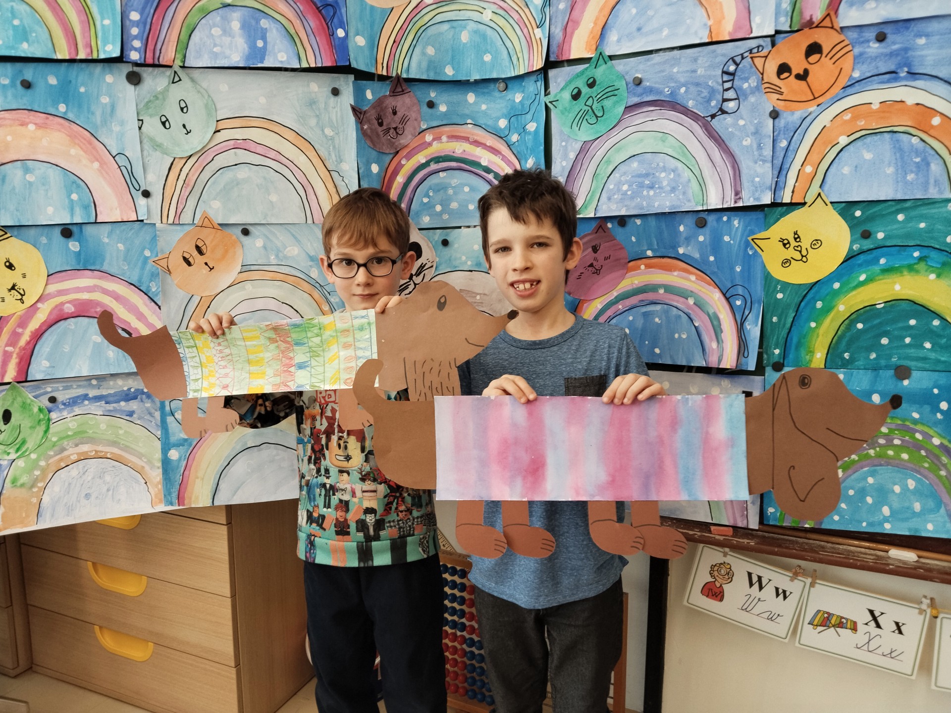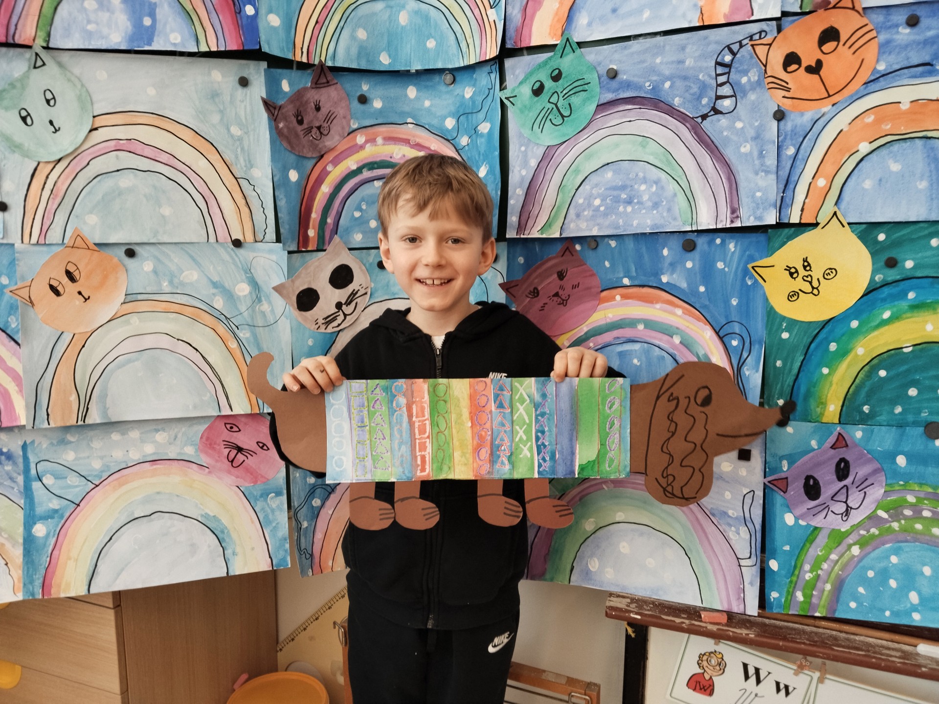 V lednu jsme si namalovali jezevčíky v zimních svetrech, zasněžené kočky a sněhuláky. Také jsme si vytvořili myšky s tvrdými a měkkými souhláskami.