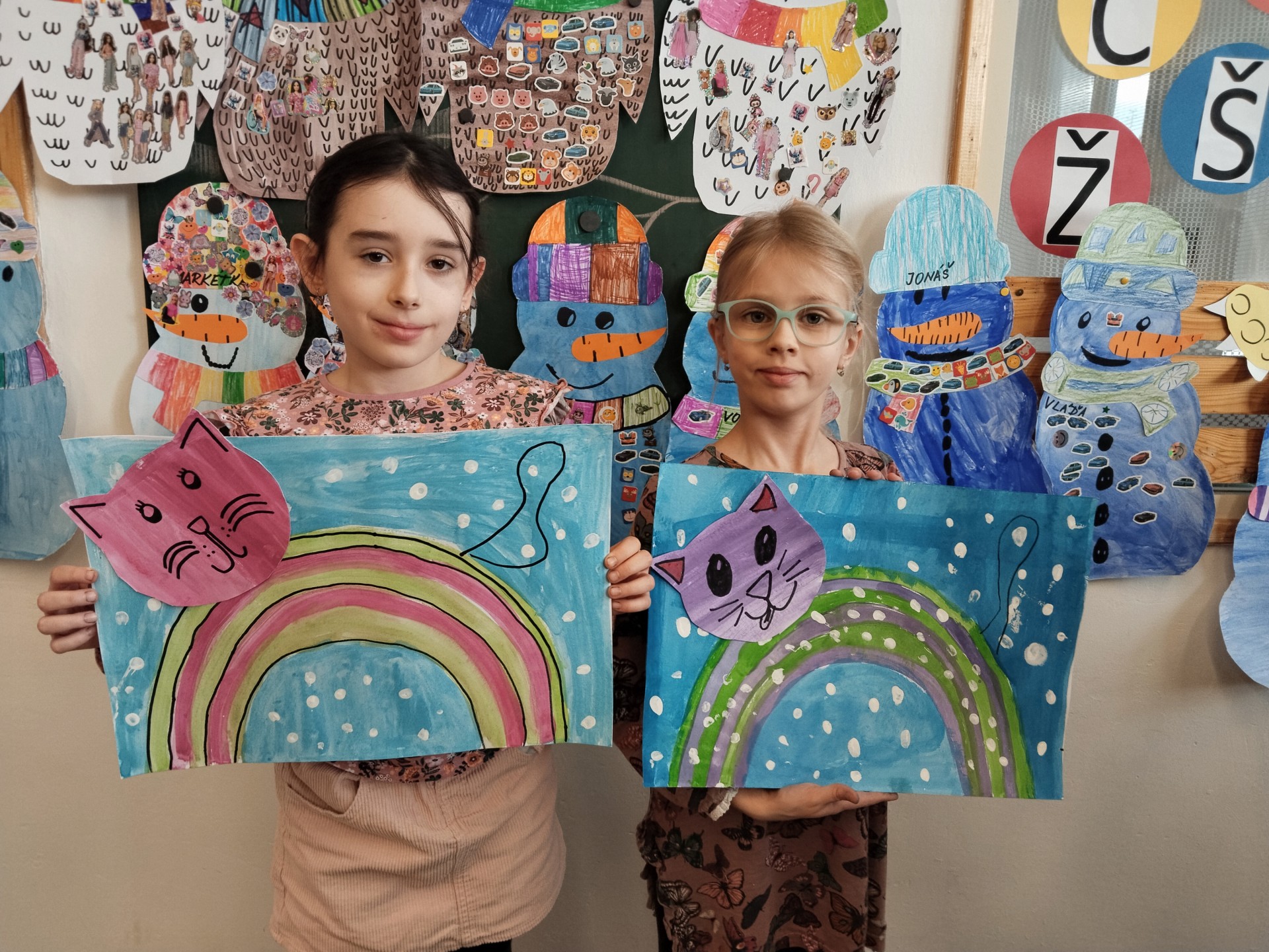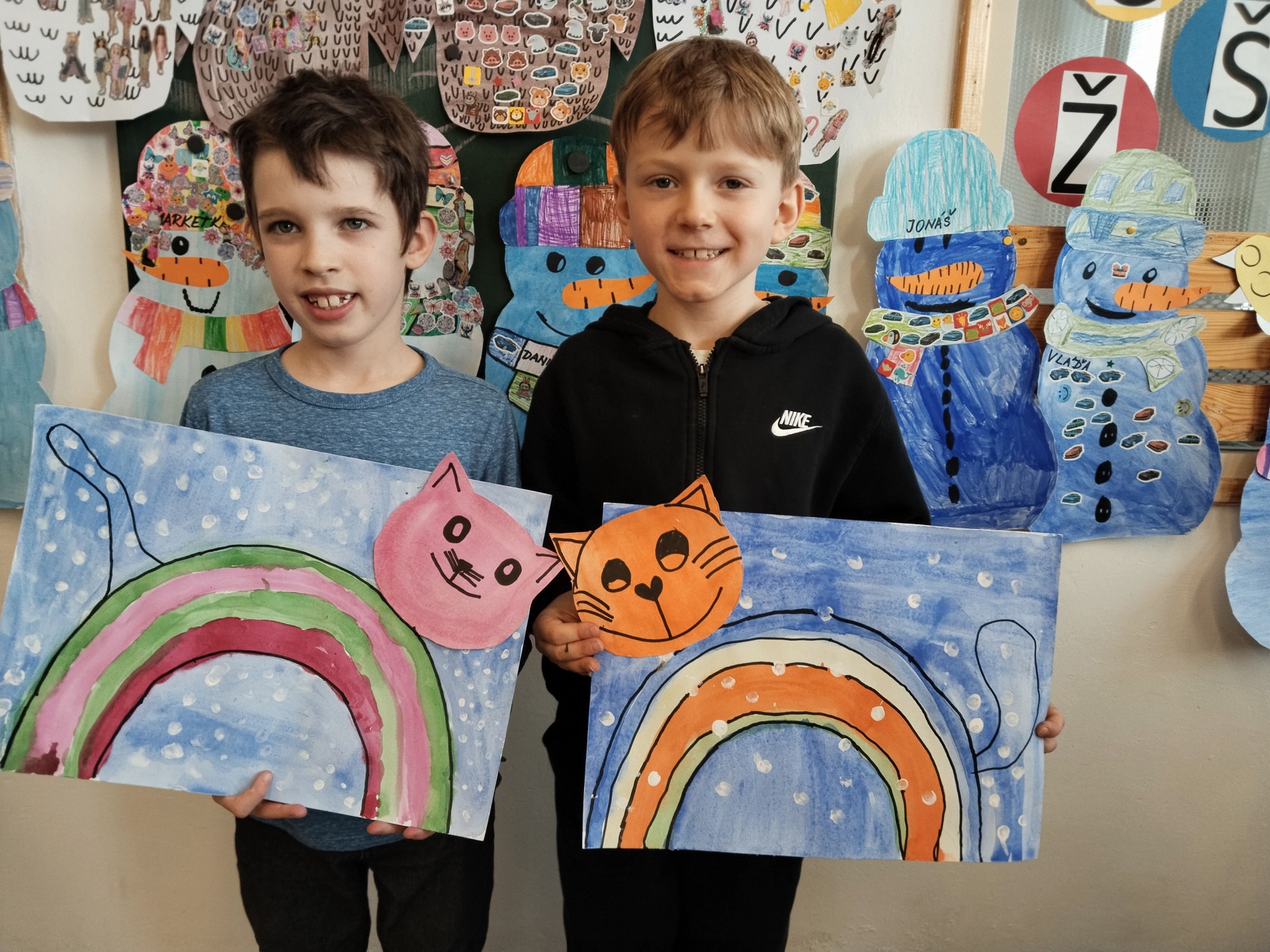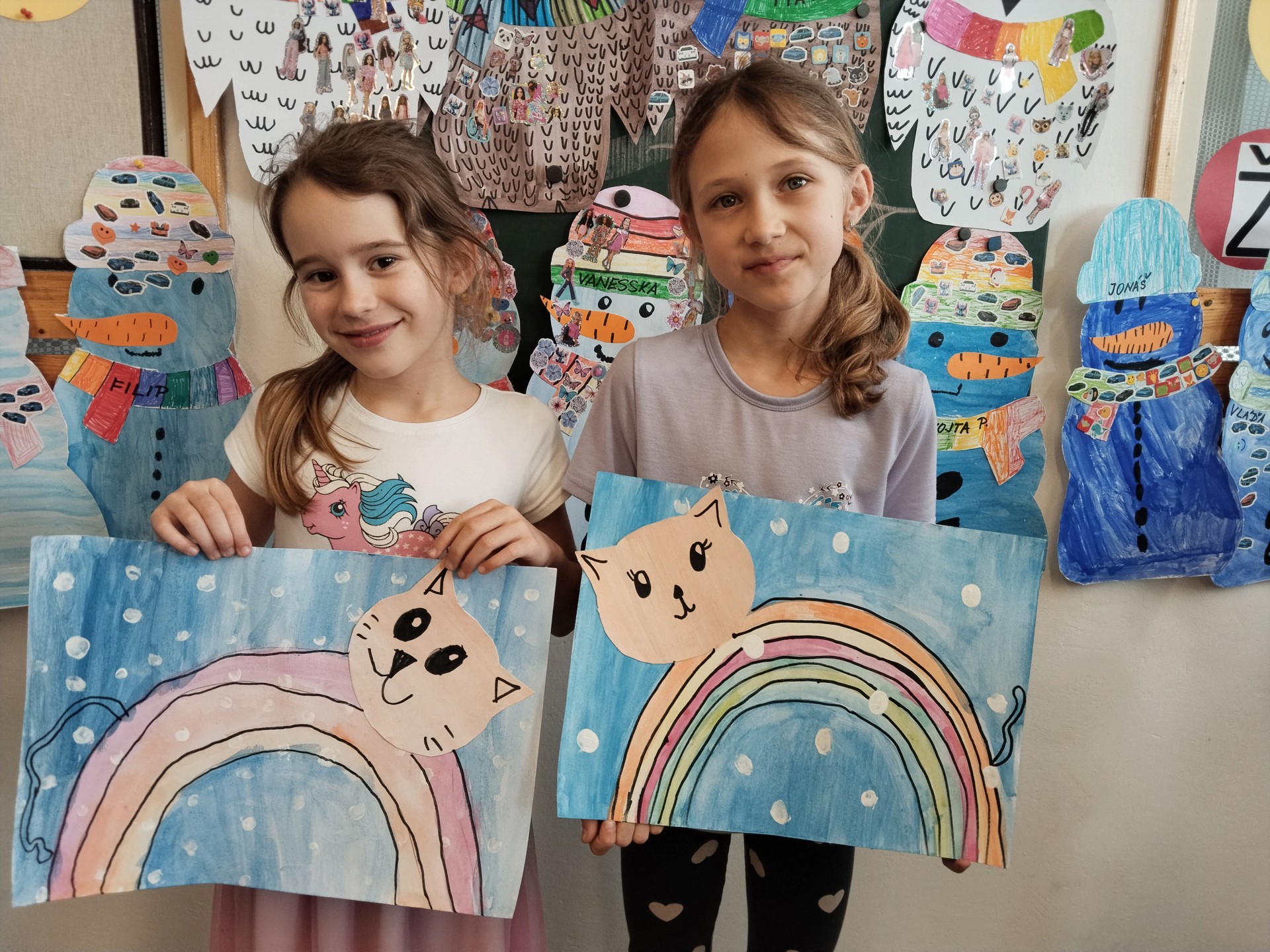 V lednu jsme si namalovali jezevčíky v zimních svetrech, zasněžené kočky a sněhuláky. Také jsme si vytvořili myšky s tvrdými a měkkými souhláskami.