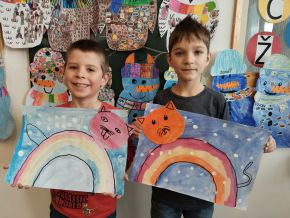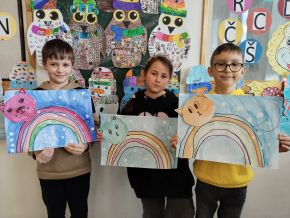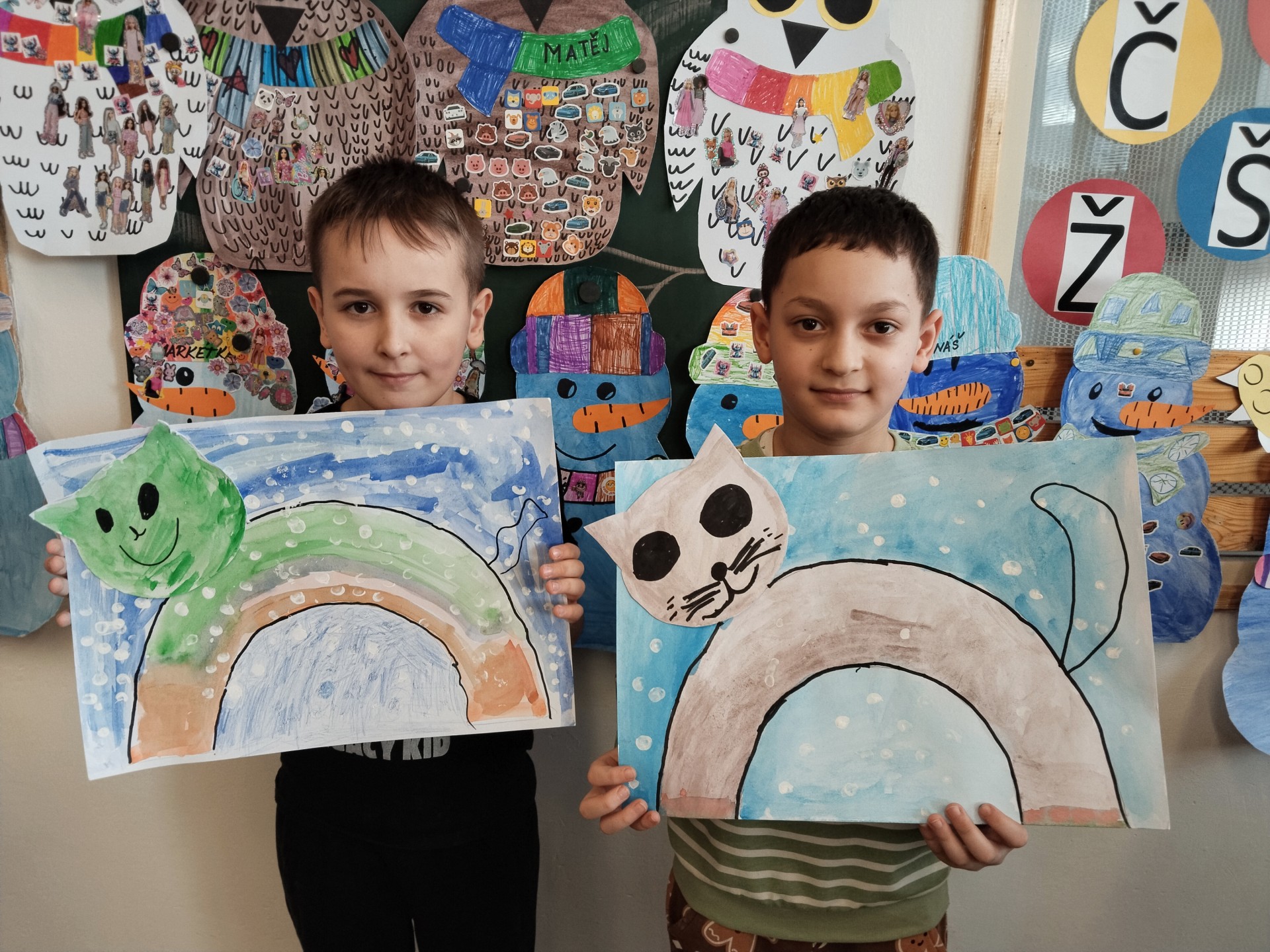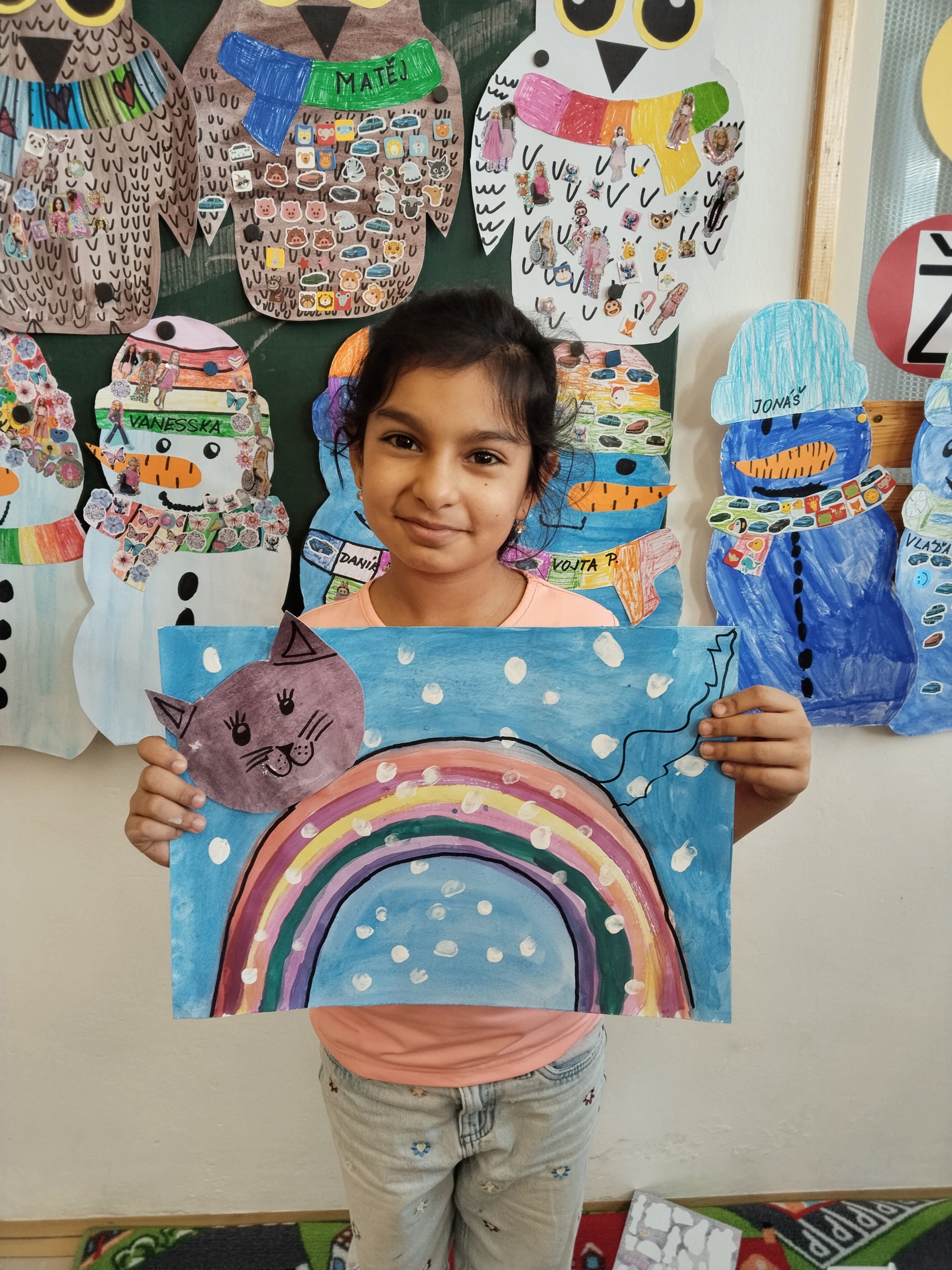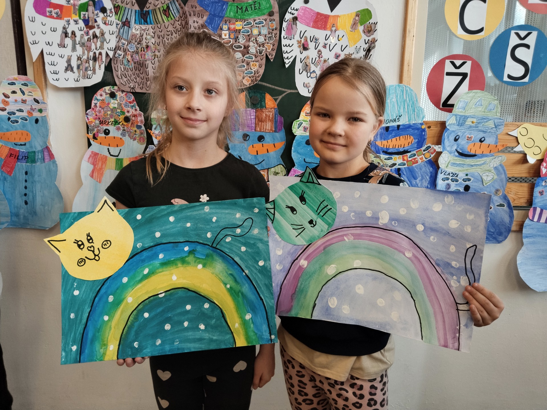 V lednu jsme si namalovali jezevčíky v zimních svetrech, zasněžené kočky a sněhuláky. Také jsme si vytvořili myšky s tvrdými a měkkými souhláskami.