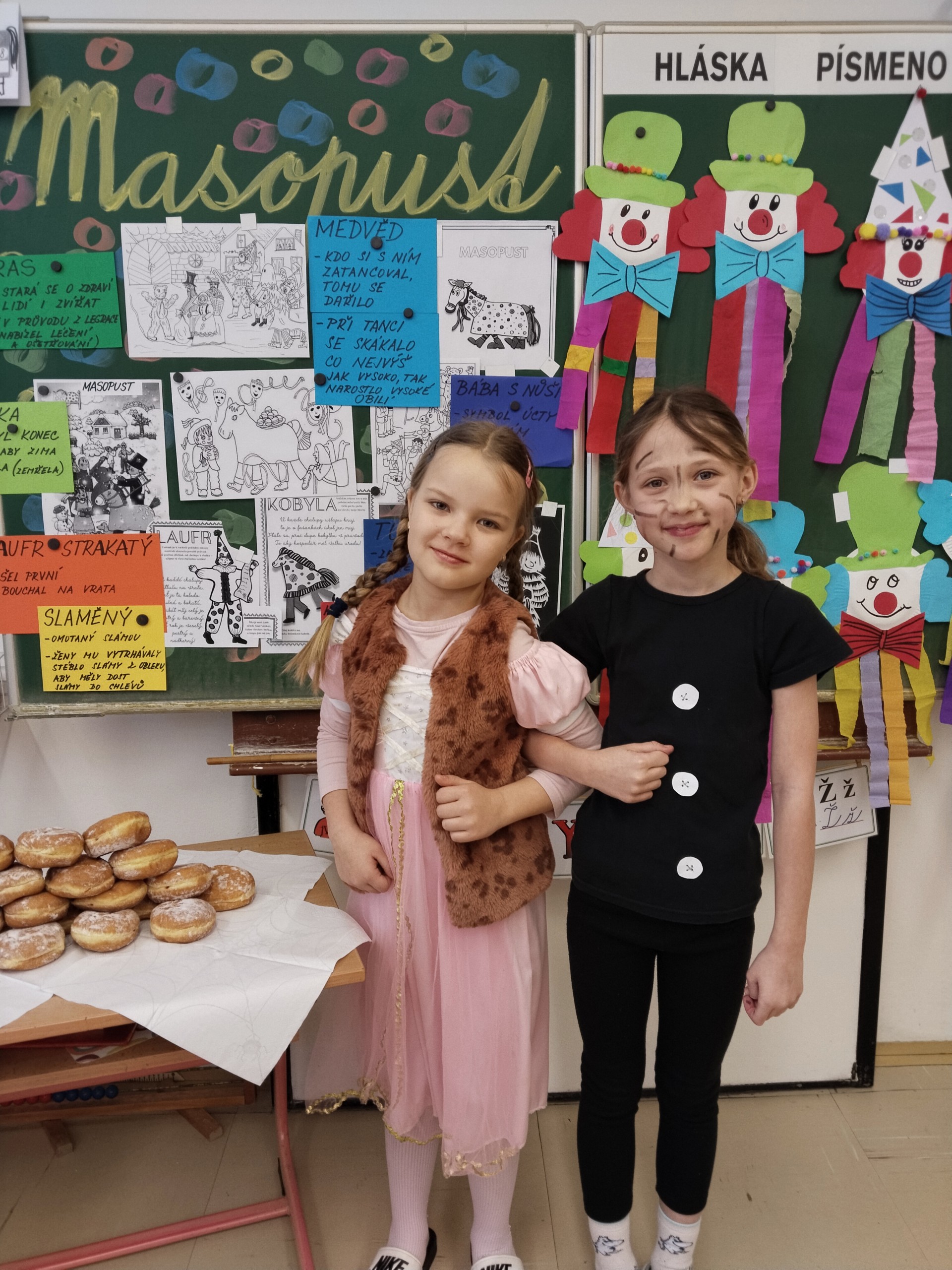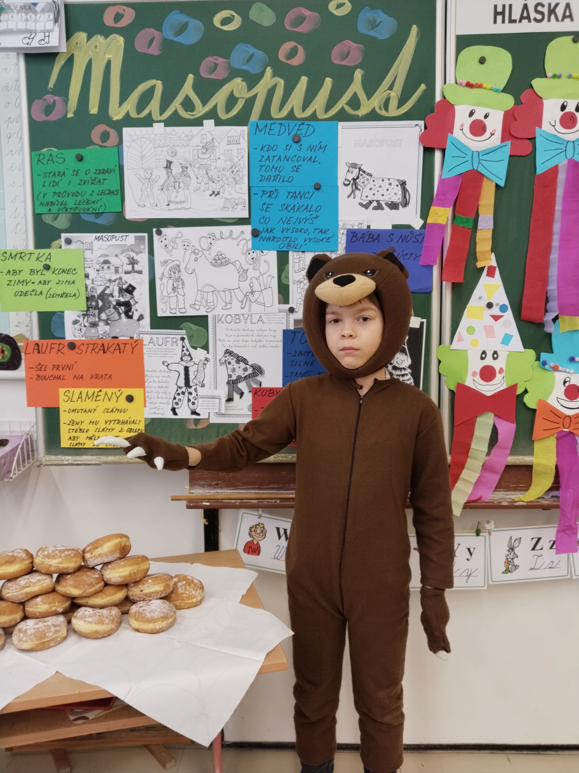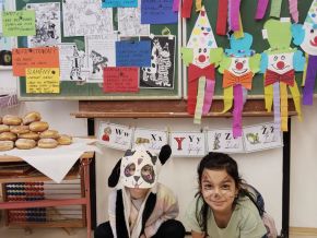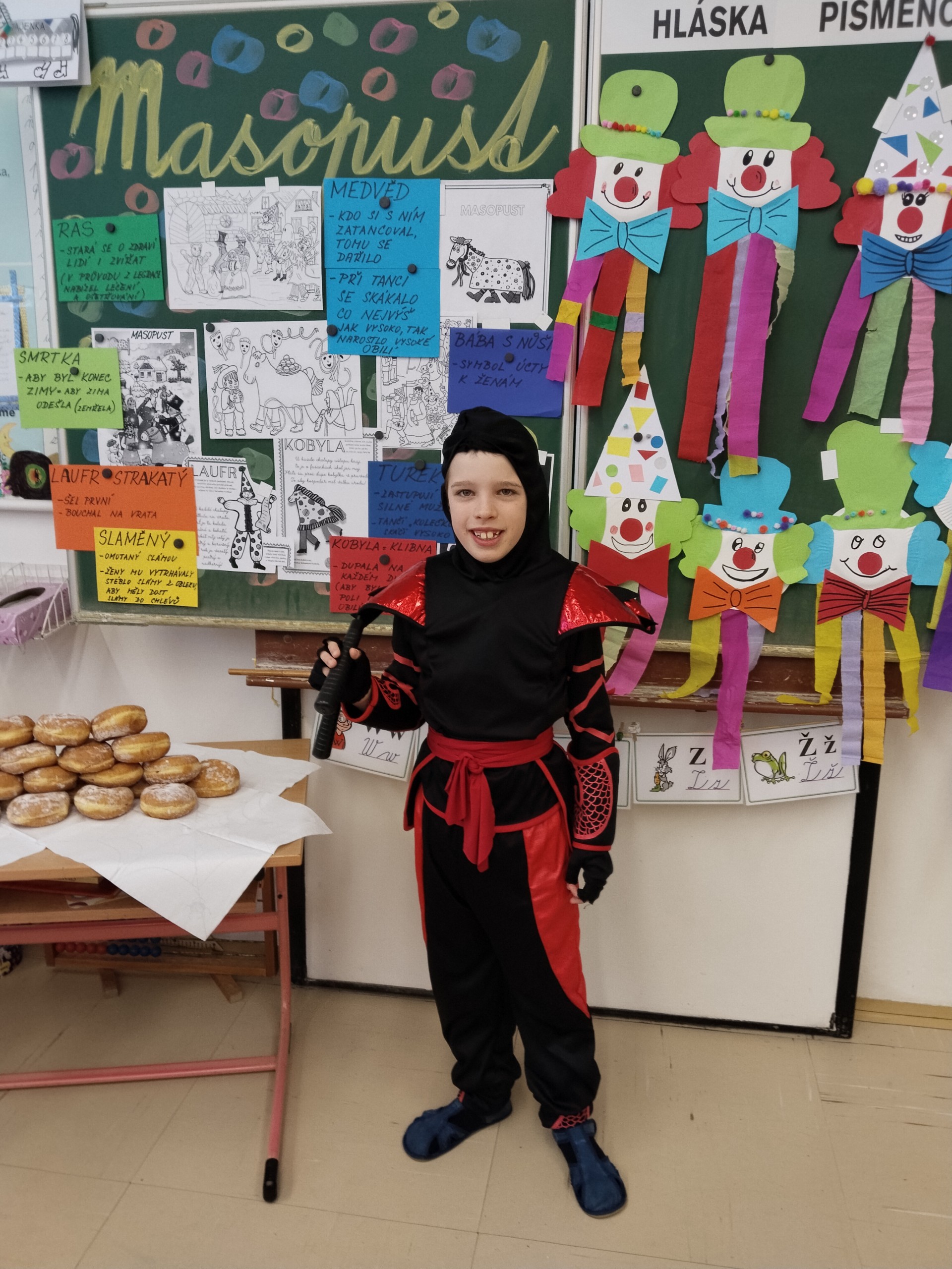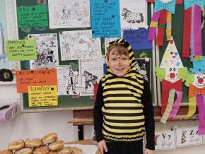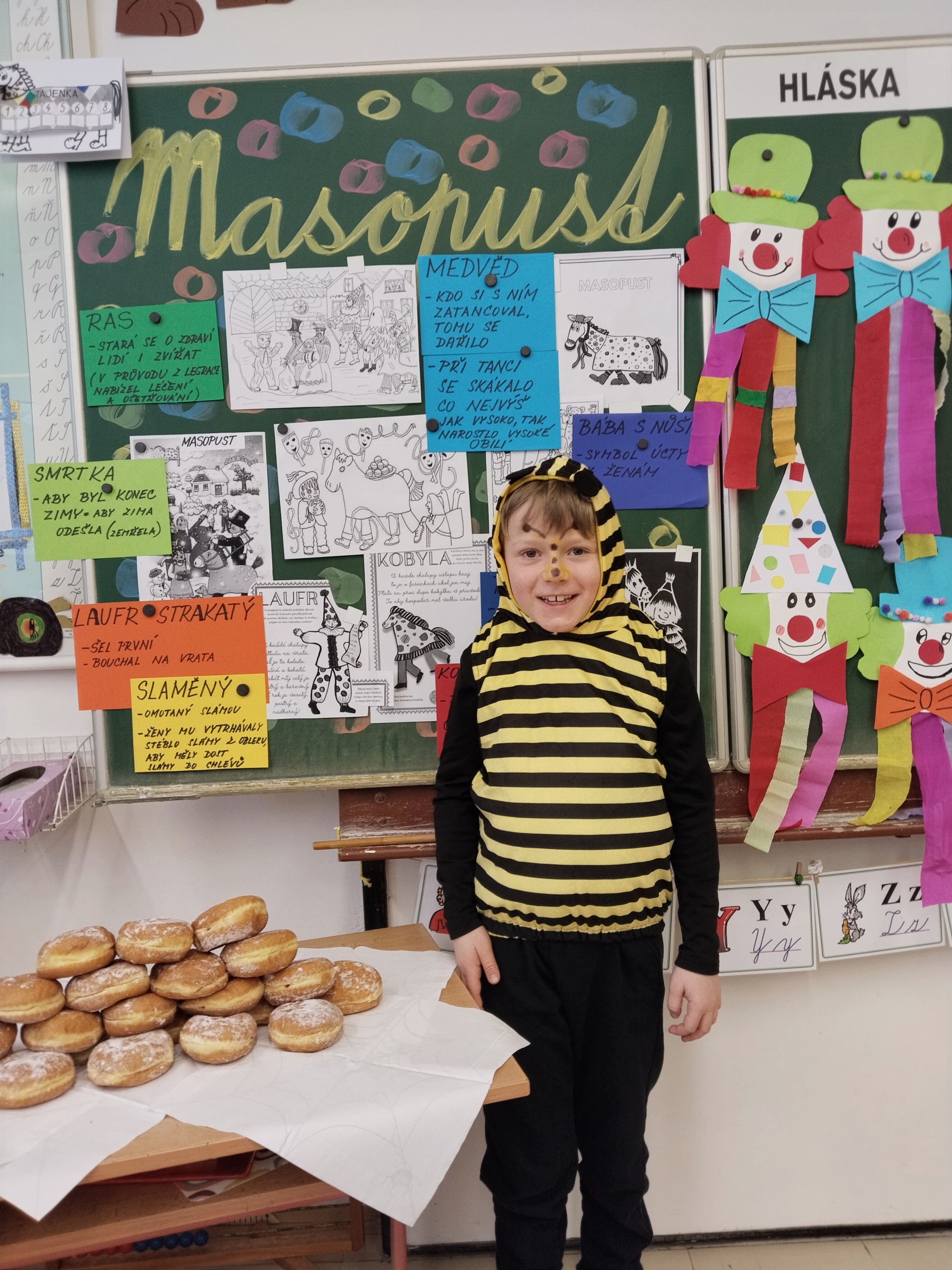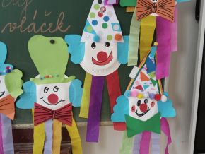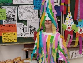 Náš masopustní pátek se skvěle vydařil. Užili jsme si soutěže, dozvěděli se hodně věcí o masopustních tradicích a maškarách, zazpívali a zatančili jsme si a taky si pochutnali na masopustních koblihách. Moc za ně děkujeme rodičům Kubíka Taubera. Po svačině jsme se vypravili na průvod po škole. V čele šel stejně jako při každém pravém průvodu Laufr, který obvykle všechny vede od domu k domu a tluče na vrata. Náš Laufr zabouchal na dveře ředitelny, které se otevřely, a všichni - i paní ředitelka a paní zástupkyně - jsme si pak společně zazpívali a zatančili Kalamajku. A pak už jsme se přesunuli do tělocvičny, kde jsme si zatančili a i ,,tanečně" zasoutěžili ještě jednou. Snad se nám příští rok povede karnevalový den zase takhle parádně!