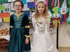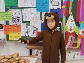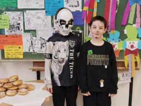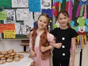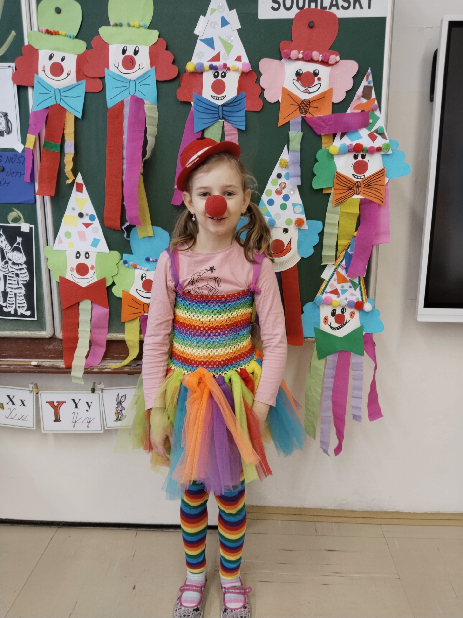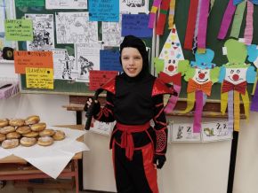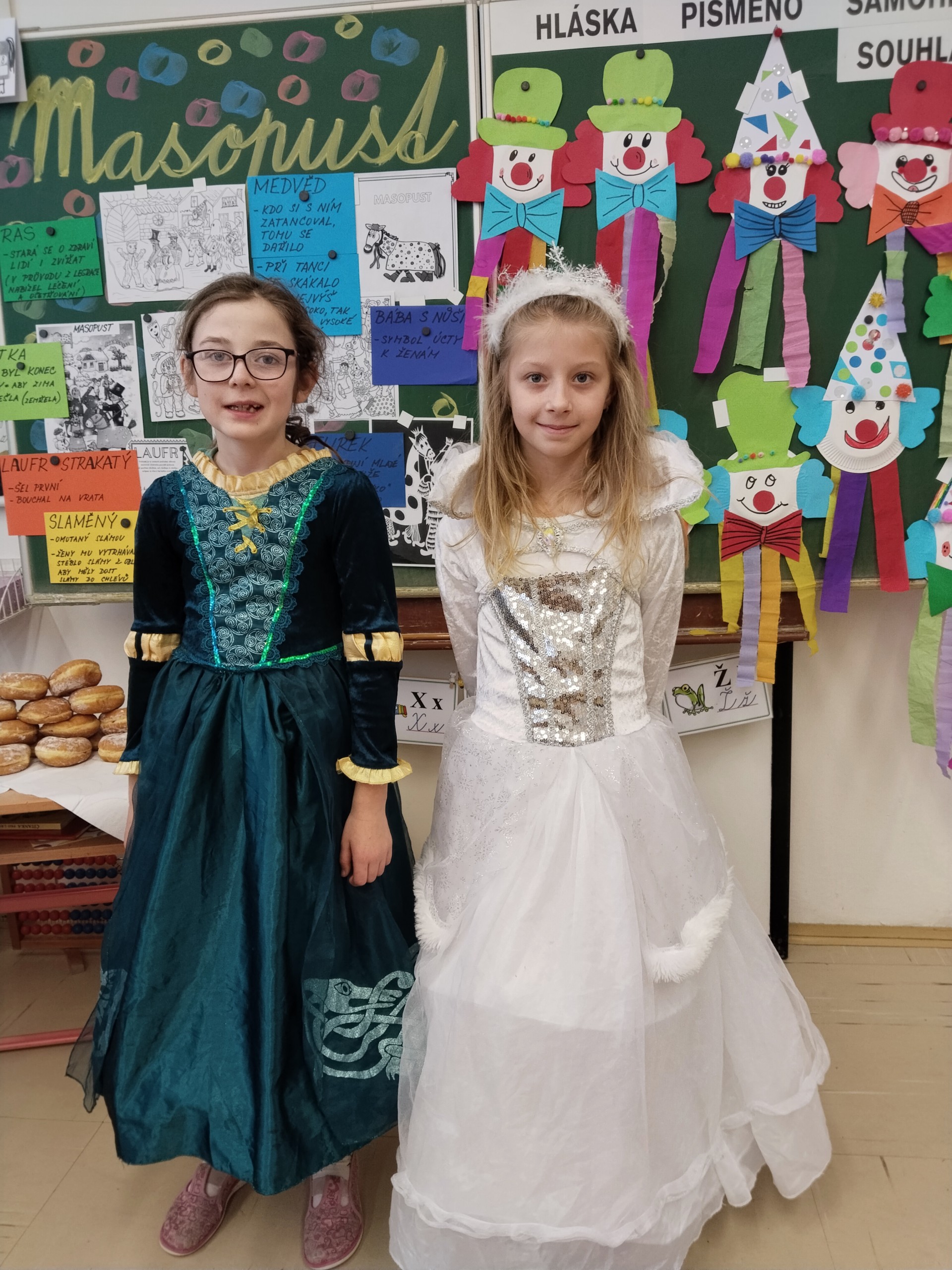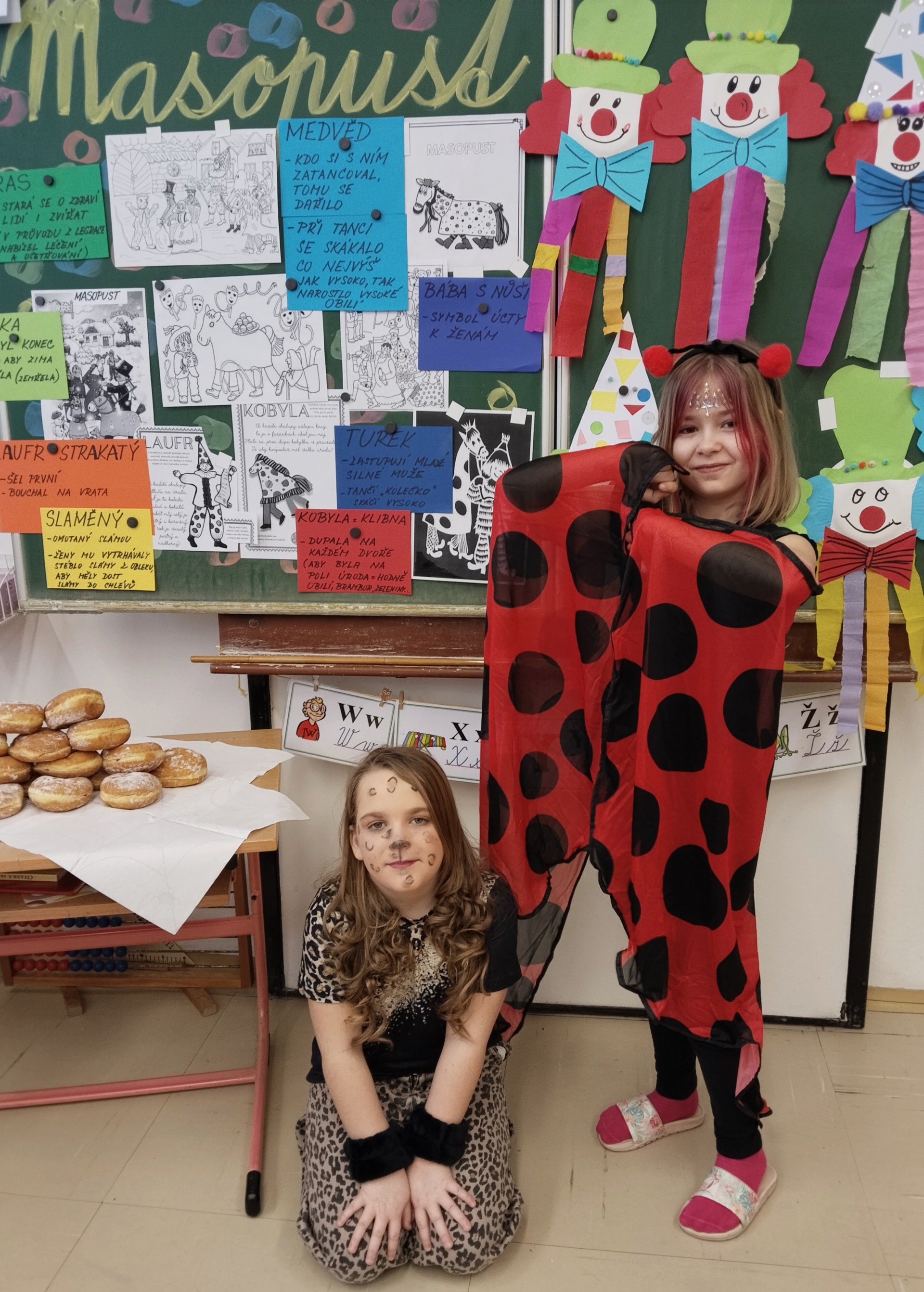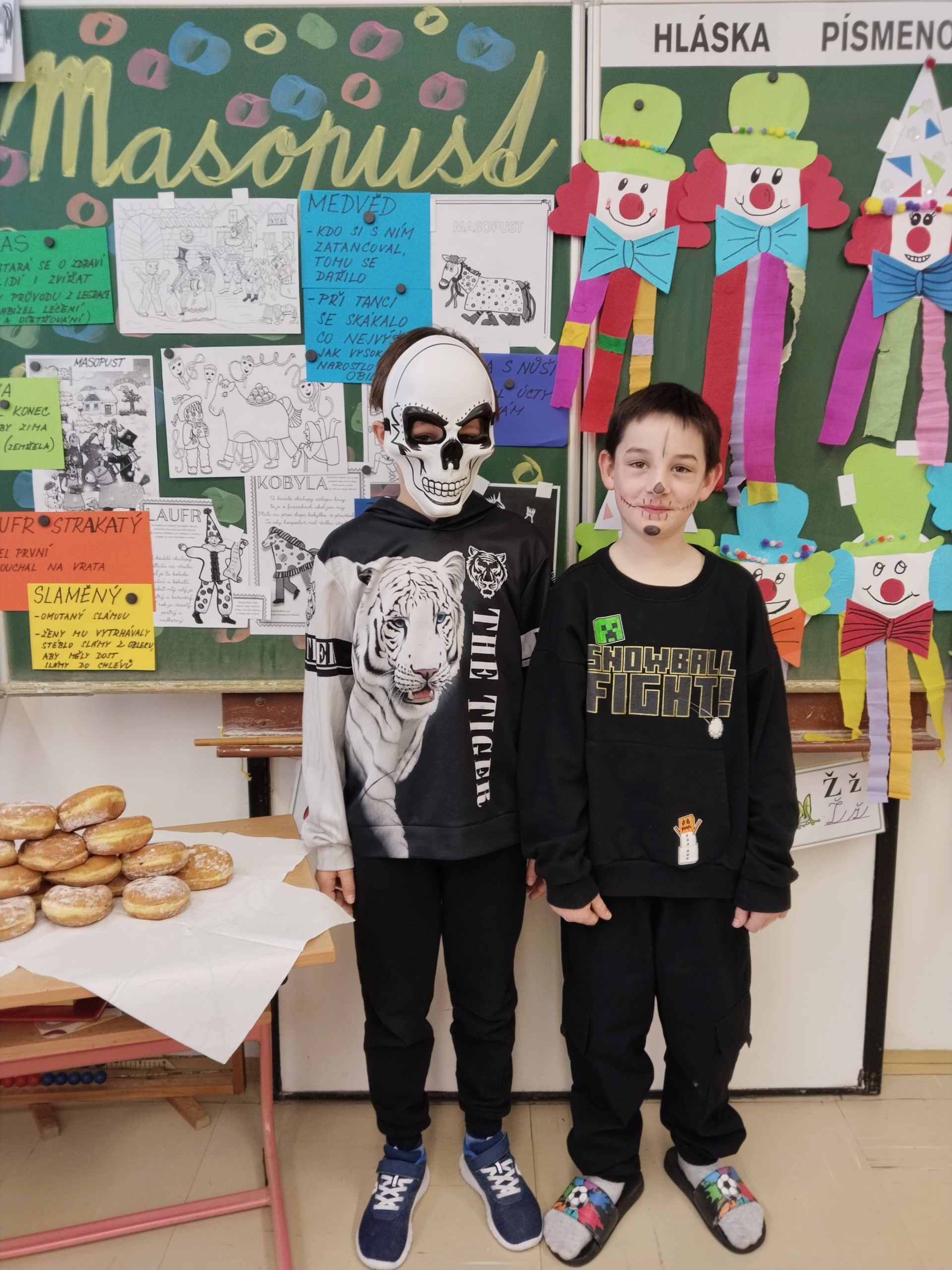 Náš masopustní pátek se skvěle vydařil. Užili jsme si soutěže, dozvěděli se hodně věcí o masopustních tradicích a maškarách, zazpívali a zatančili jsme si a taky si pochutnali na masopustních koblihách. Moc za ně děkujeme rodičům Kubíka Taubera. Po svačině jsme se vypravili na průvod po škole. V čele šel stejně jako při každém pravém průvodu Laufr, který obvykle všechny vede od domu k domu a tluče na vrata. Náš Laufr zabouchal na dveře ředitelny, které se otevřely, a všichni - i paní ředitelka a paní zástupkyně - jsme si pak společně zazpívali a zatančili Kalamajku. A pak už jsme se přesunuli do tělocvičny, kde jsme si zatančili a i ,,tanečně" zasoutěžili ještě jednou. Snad se nám příští rok povede karnevalový den zase takhle parádně!