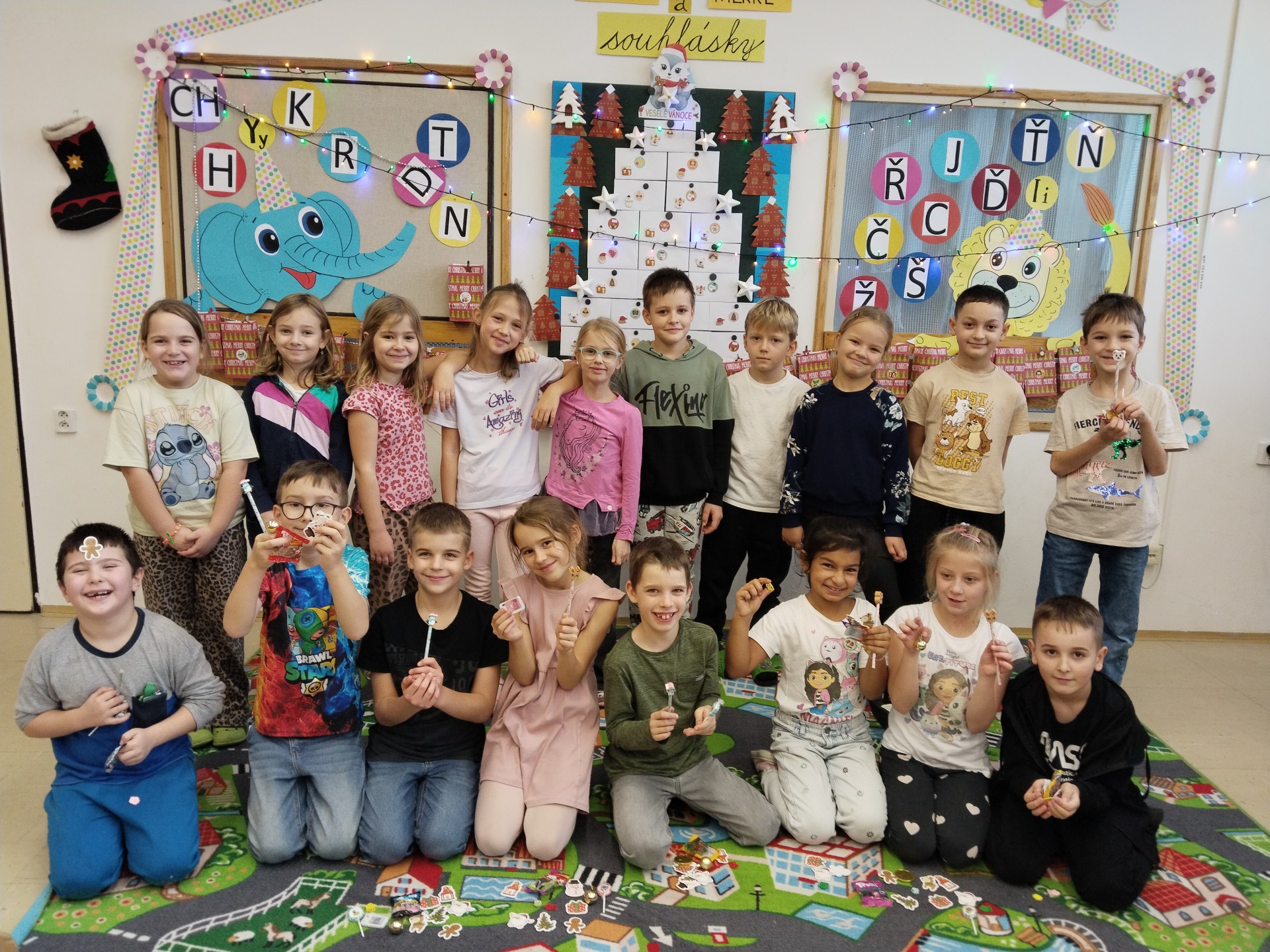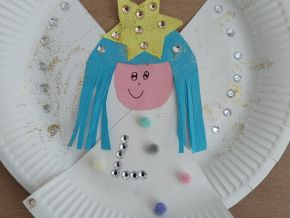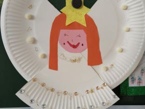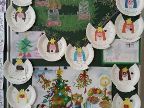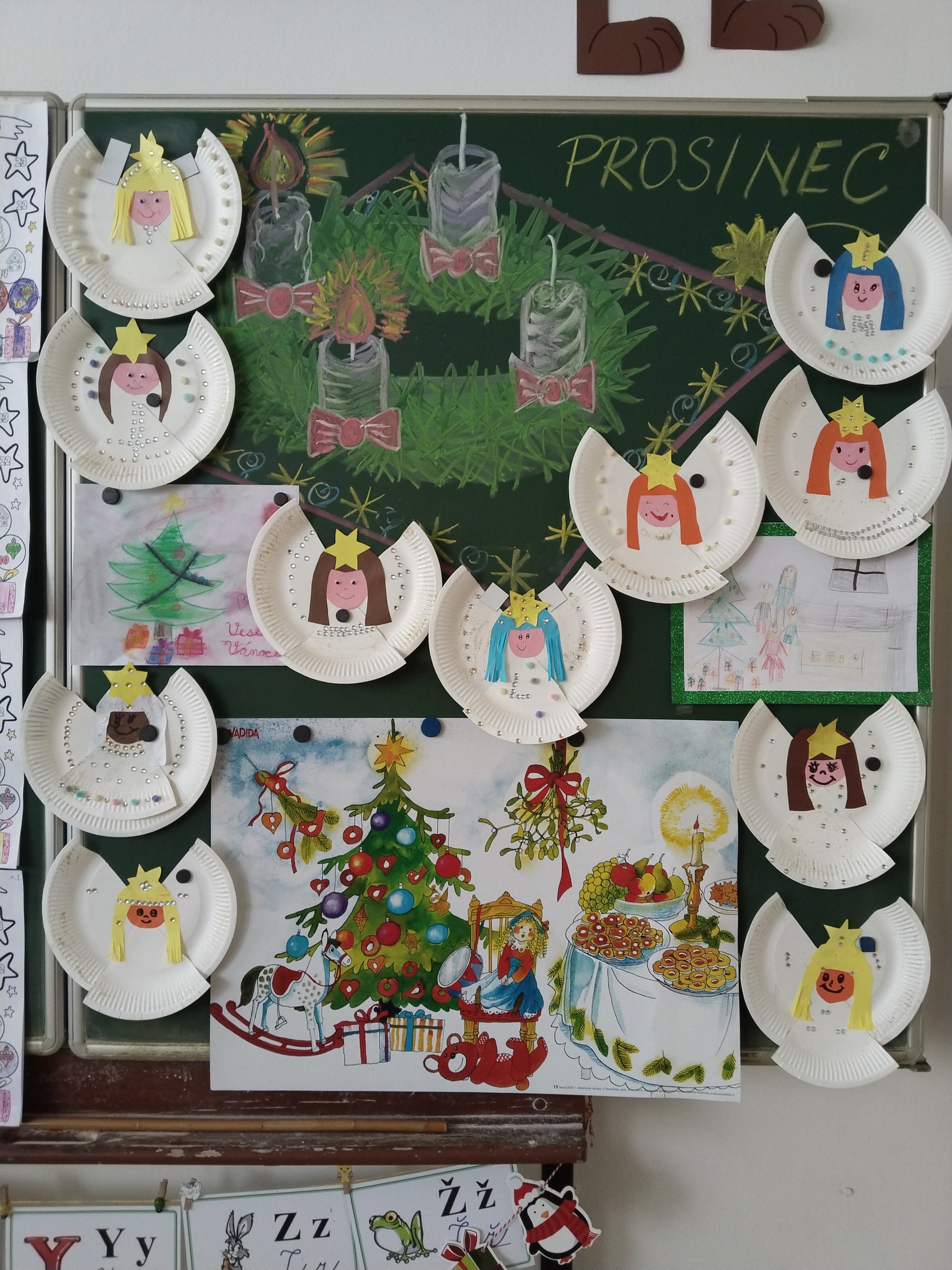 Aby nám čas do Vánoc hezky utíkal, losujeme každý den z vánoční punčochy jména a otevíráme očíslované pytlíčky s malými dárečky. Strom máme poskládaný z obálek s přáníčky, která si odneseme domů. Také si ještě necháme obálky orazítkovat na Ježíškovské poště na radnici. Už zbývá jen pár posledních jmen a konečně budeme vylosováni všichni!!! A kromě počítání kalendáře také vyrábíme vánoční dekorace a přáníčka. Třeba tyhle krásné andílky.