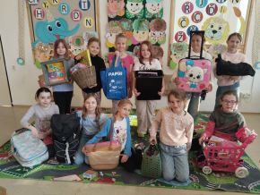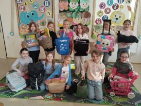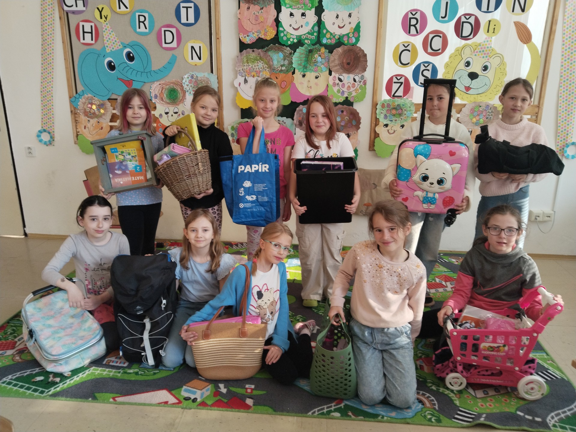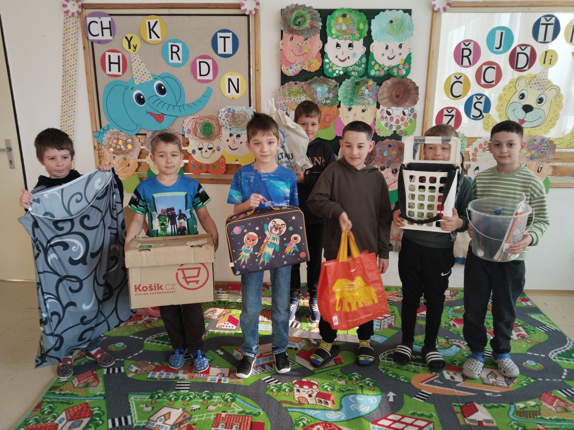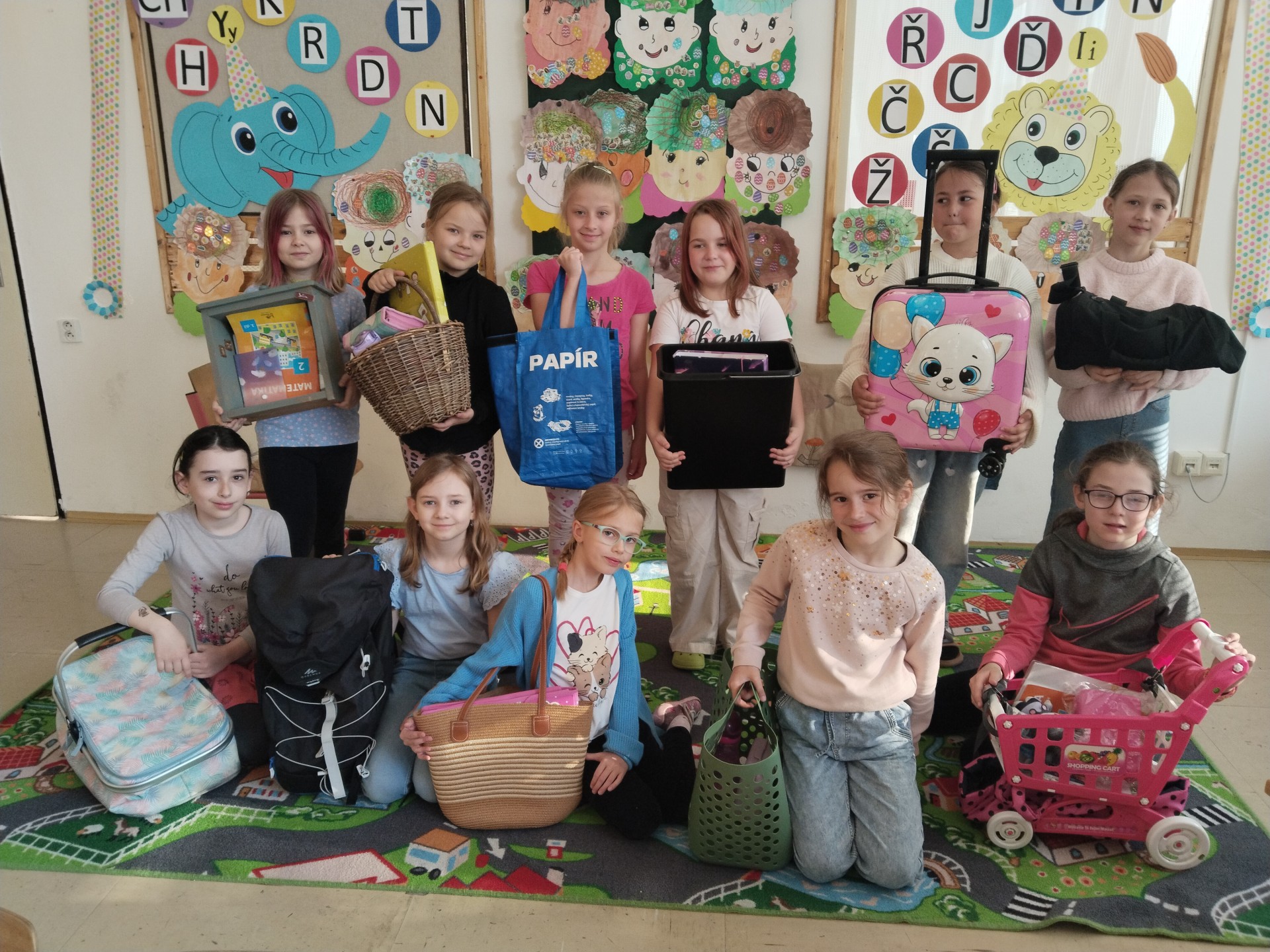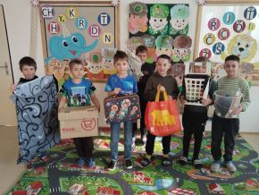 Dnes jsme mohli ve třídě vidět hodně zajímavé varianty na školní aktovky - krabice, košíky, plážové tašky, krosny, odpadkové koše, zásuvku ze skříně a jiná originální zařízení :)). Za třídu jsme zvolili vítěze s nejoriginálnějším nápadem - Marcelku s minivozíčkem a Jendu s povlakem na polštář.