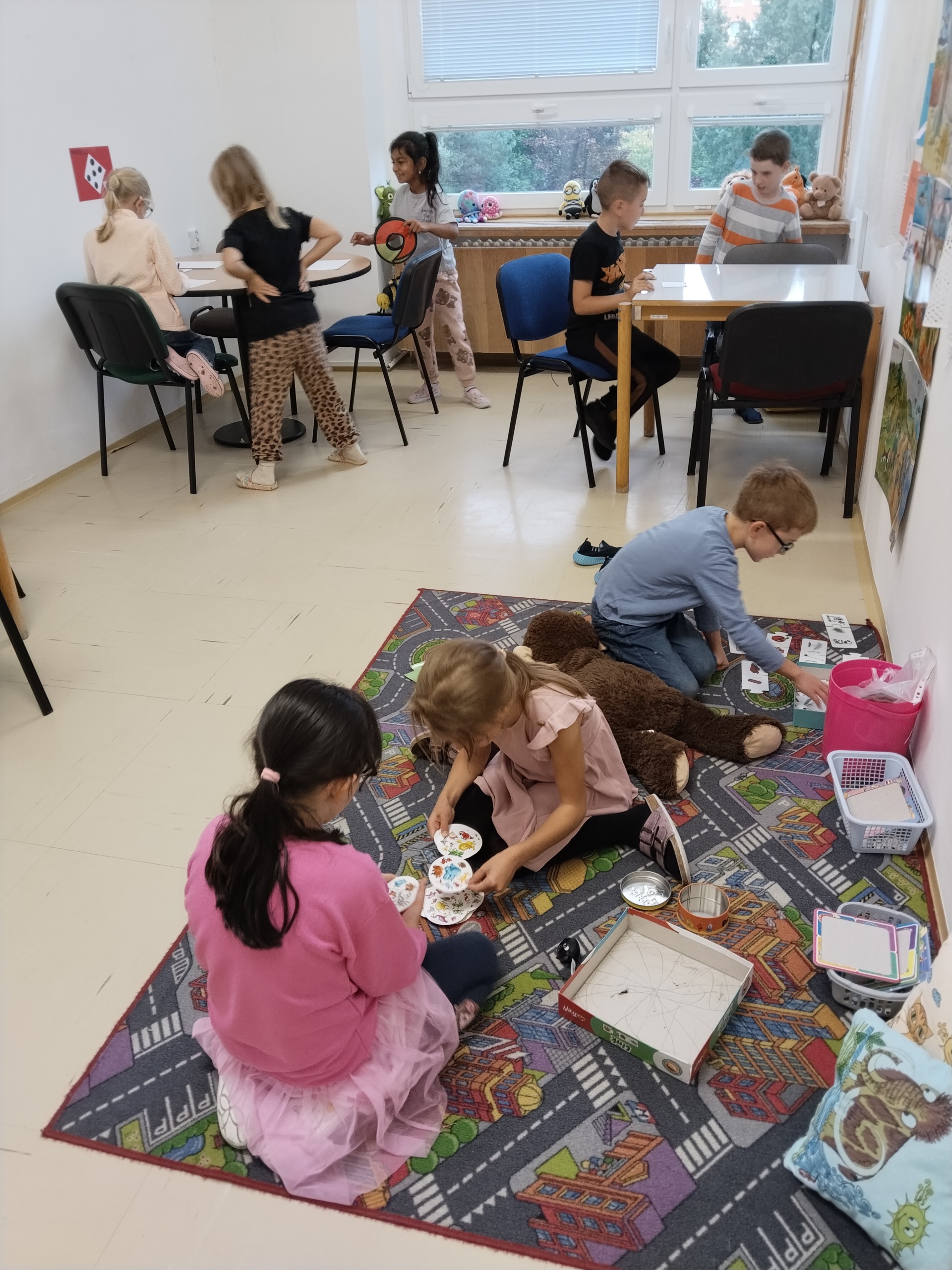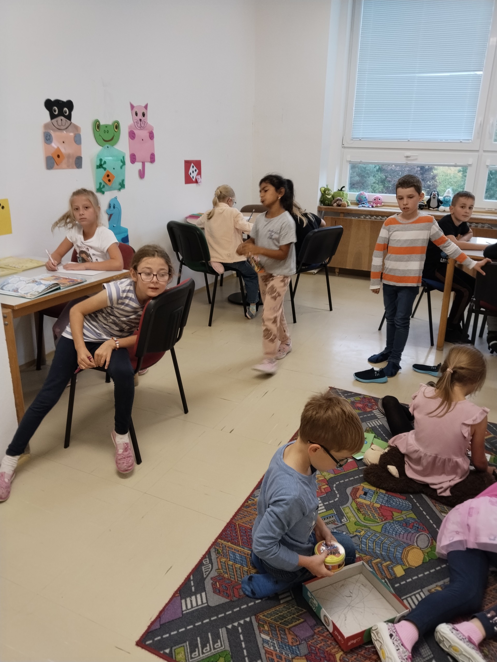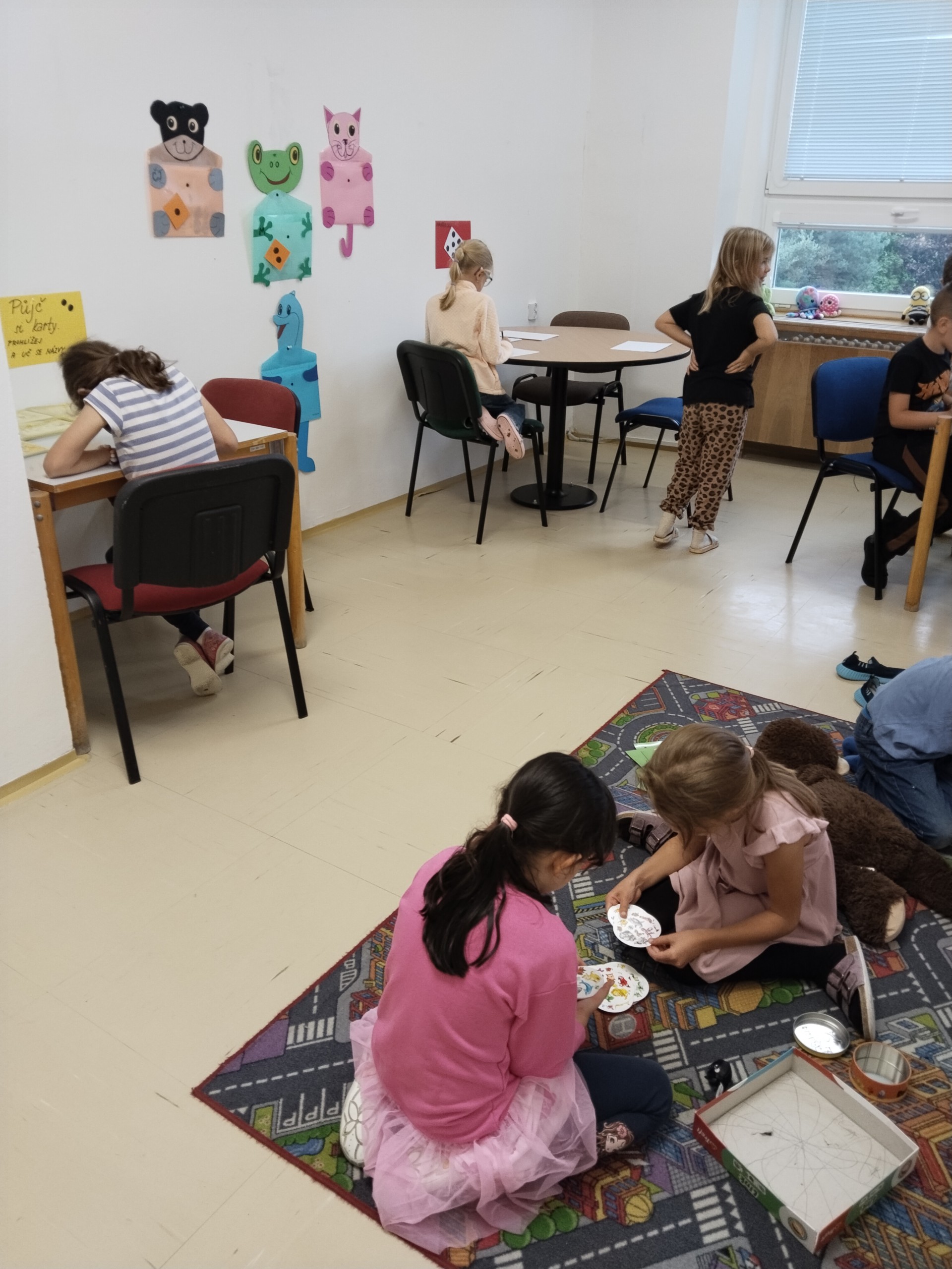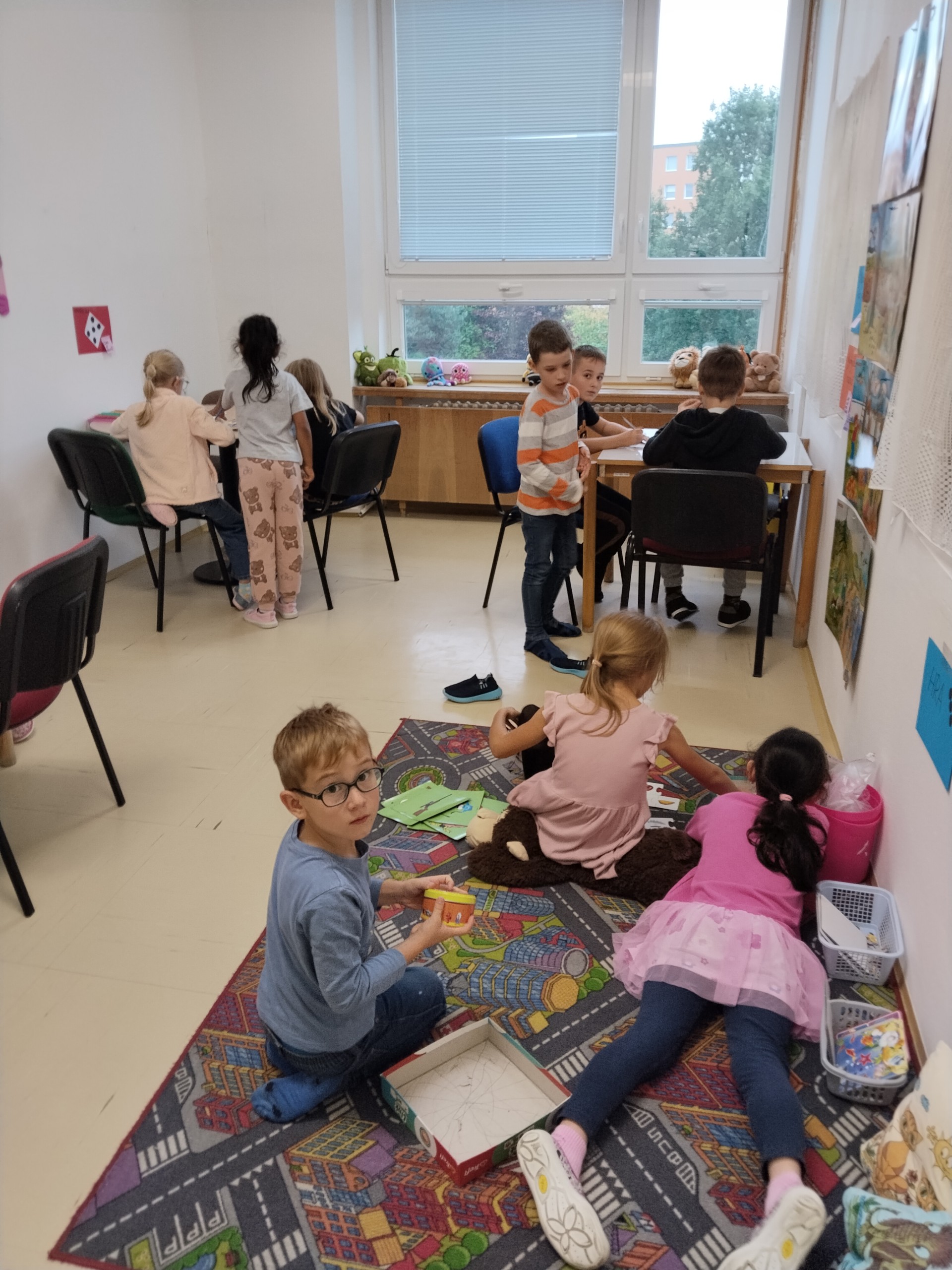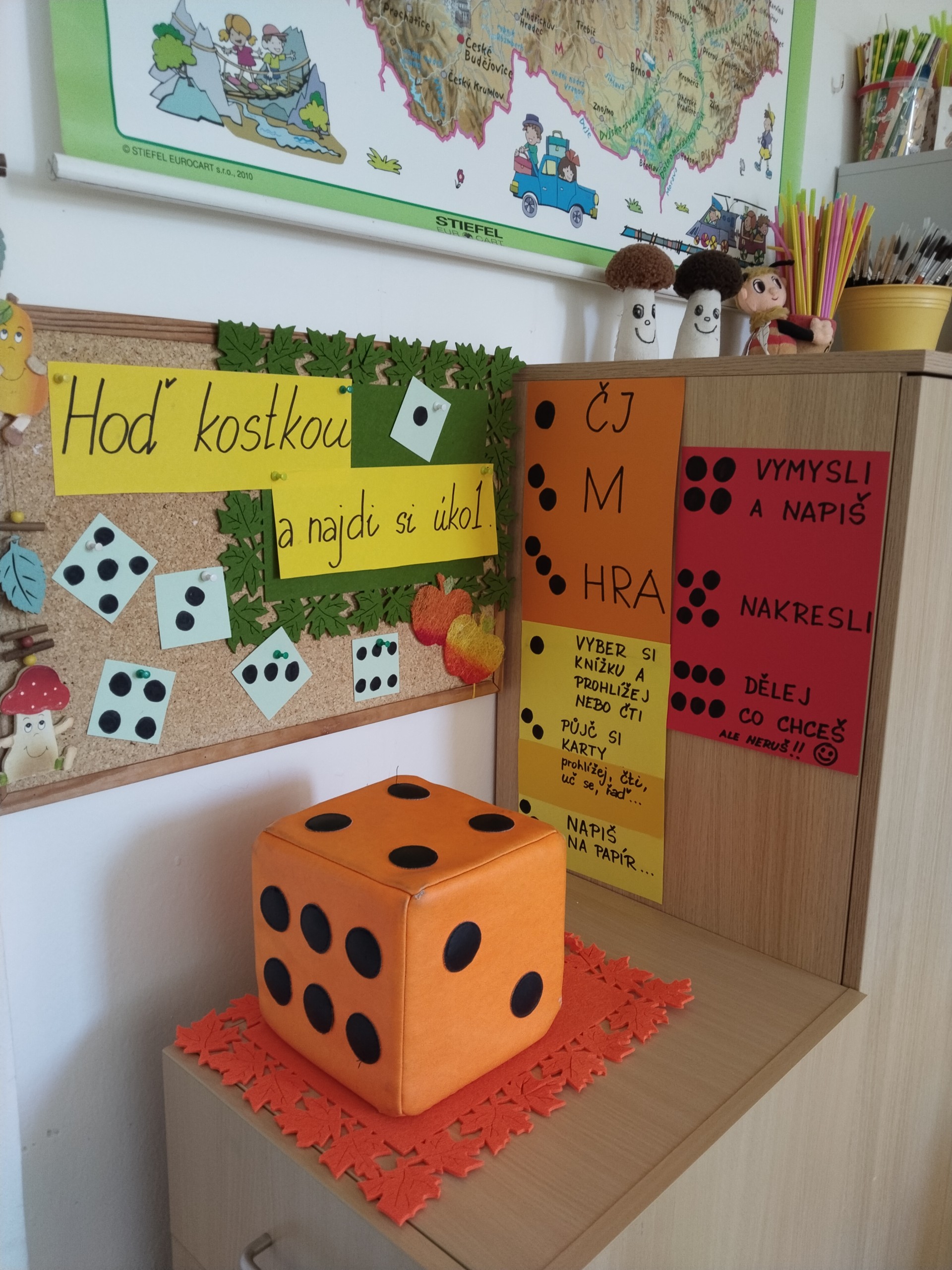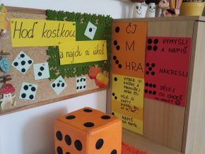 Za naší třídou máme ještě jednu místnost,kterou rádi využíváme. Rychlíci, kteří dokončí práci v hodině dřív, si mohou hodit kostkou, a pak si podle počtu puntíků najít úkol. Když se zadaří a padne šestka, znamená to vlastní výběr - může to být hraní hry, kreslení, luštění různých rébusů, ale třeba i jenom odpočinek na koberci :))).