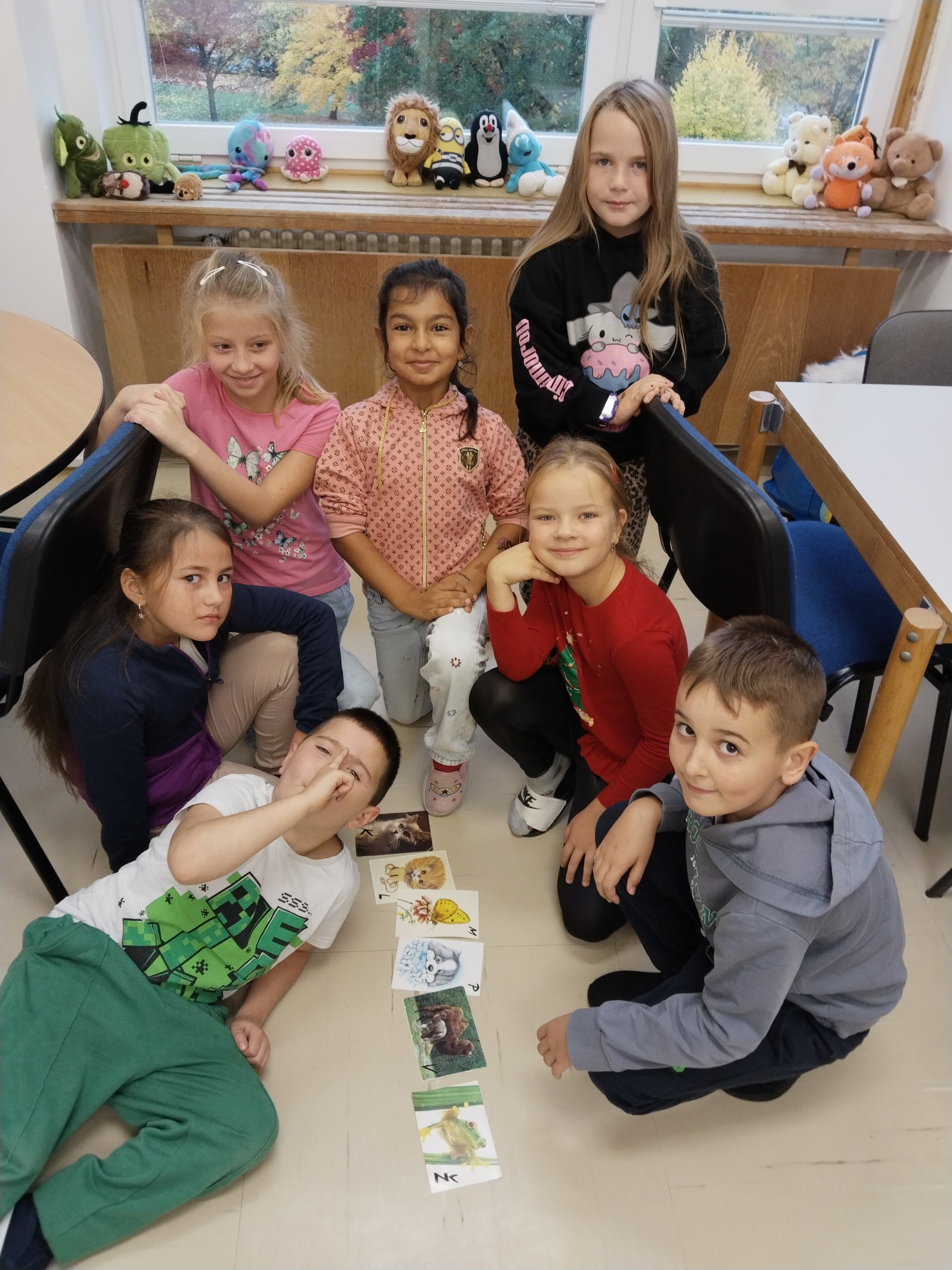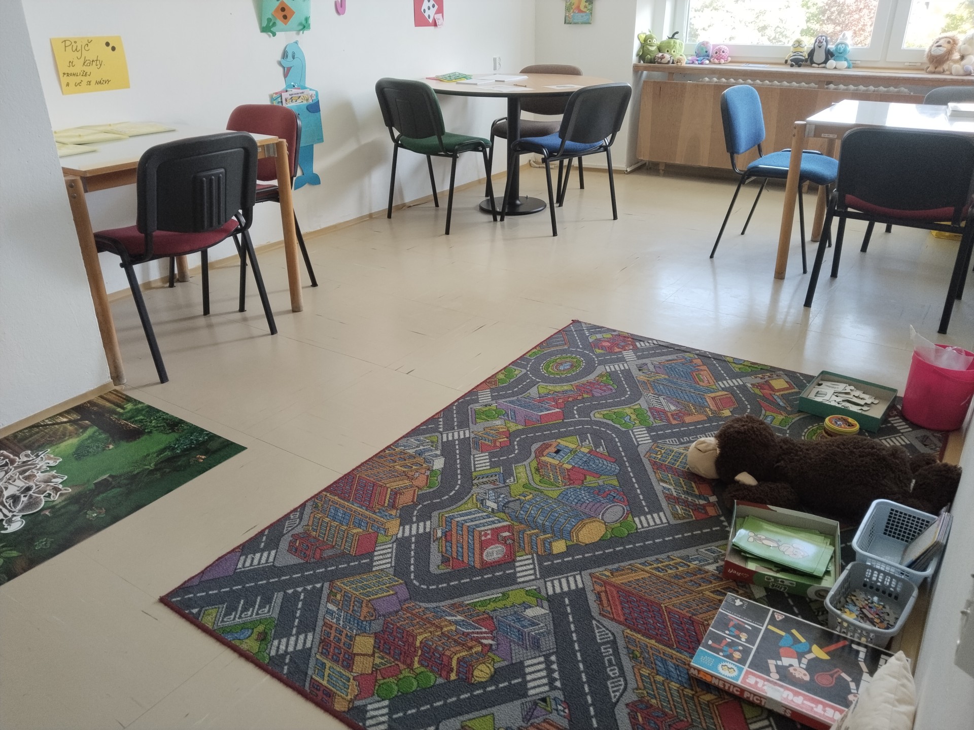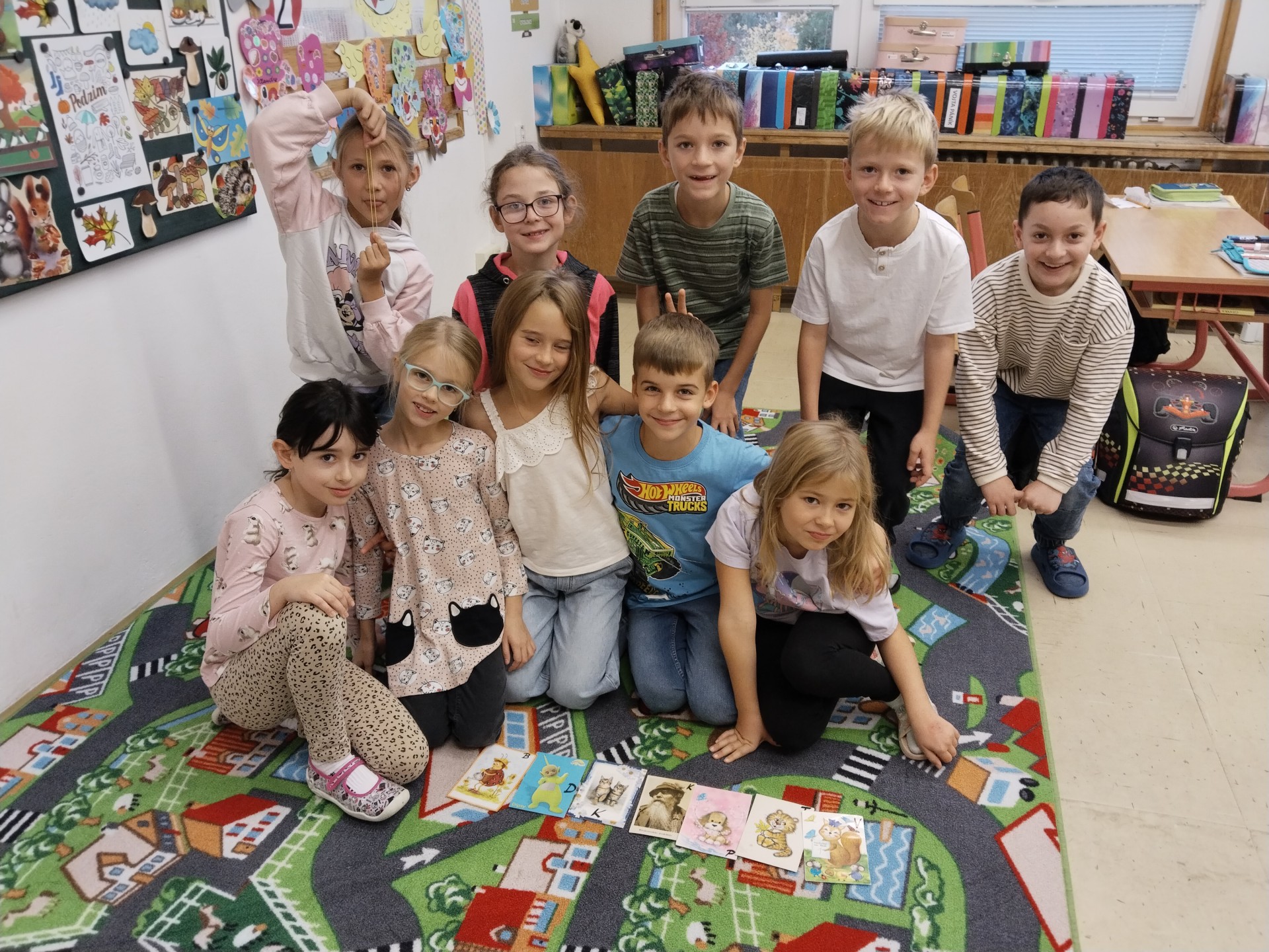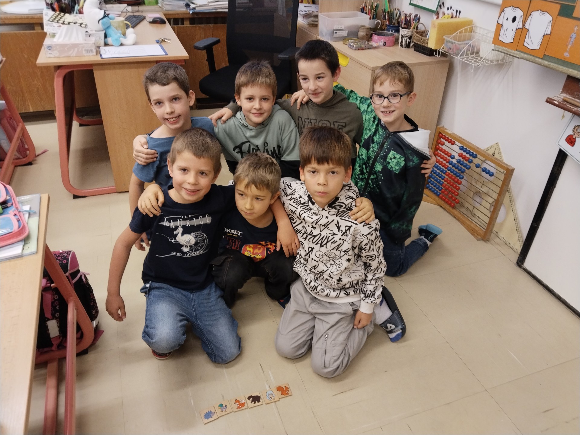 Za naší třídou máme ještě jednu místnost,kterou rádi využíváme. Rychlíci, kteří dokončí práci v hodině dřív, si mohou hodit kostkou, a pak si podle počtu puntíků najít úkol. Když se zadaří a padne šestka, znamená to vlastní výběr - může to být hraní hry, kreslení, luštění různých rébusů, ale třeba i jenom odpočinek na koberci :))).