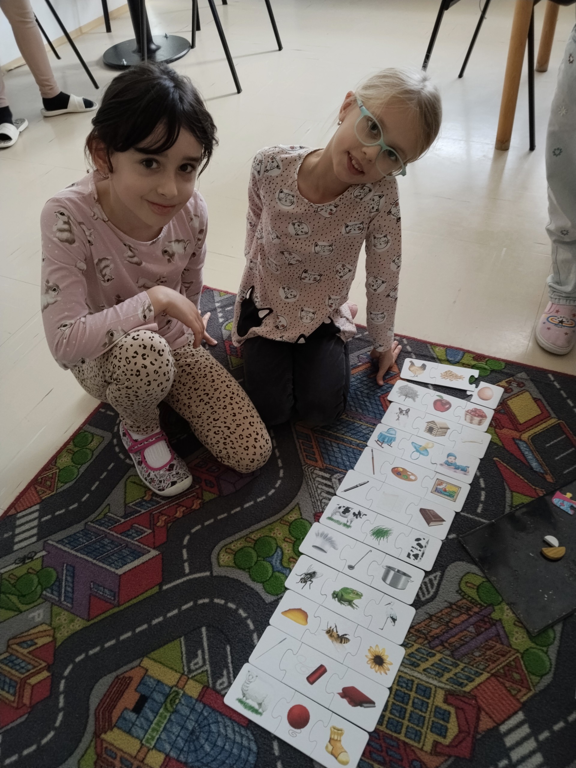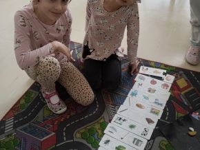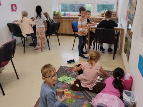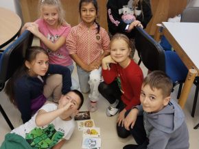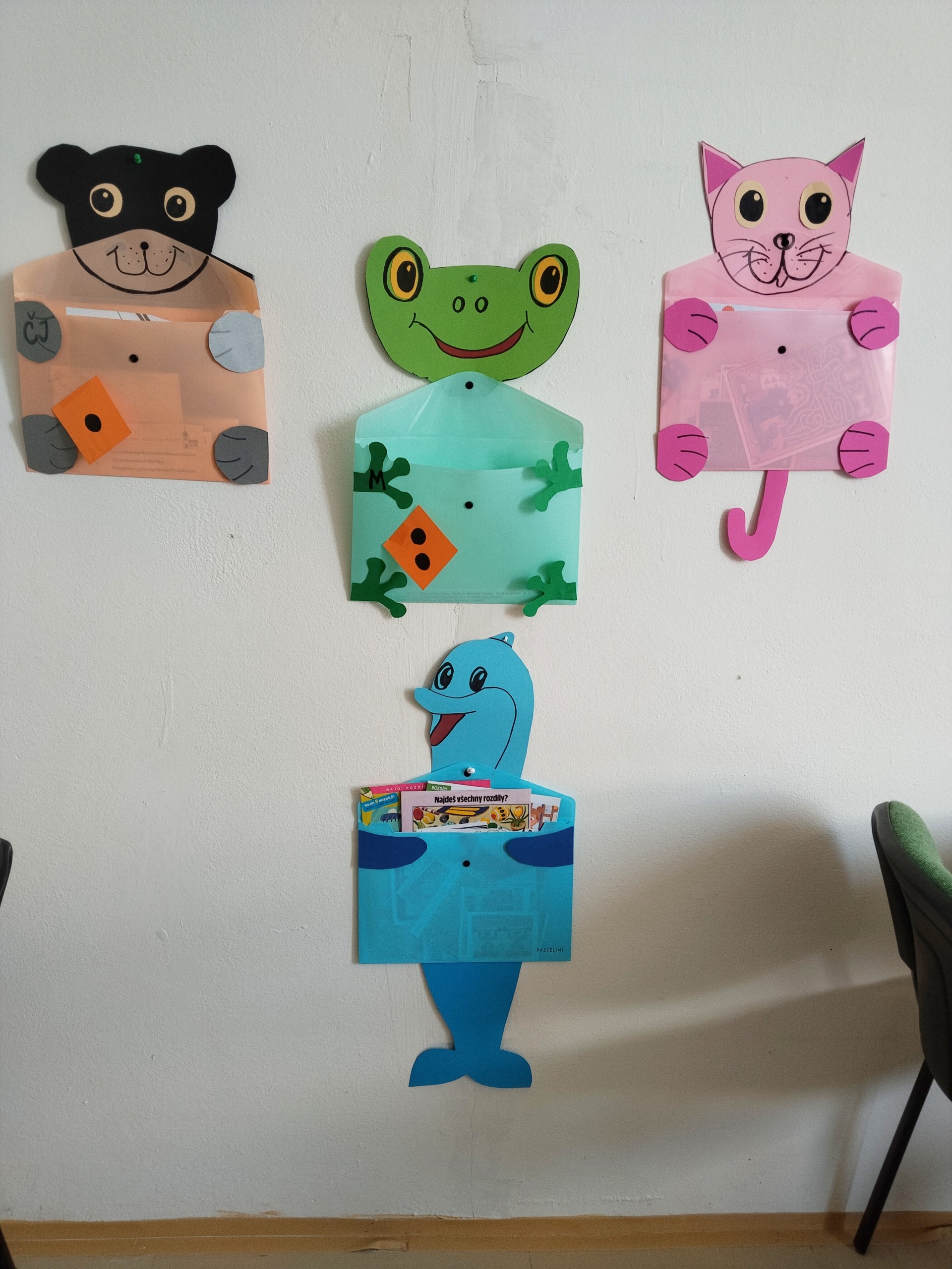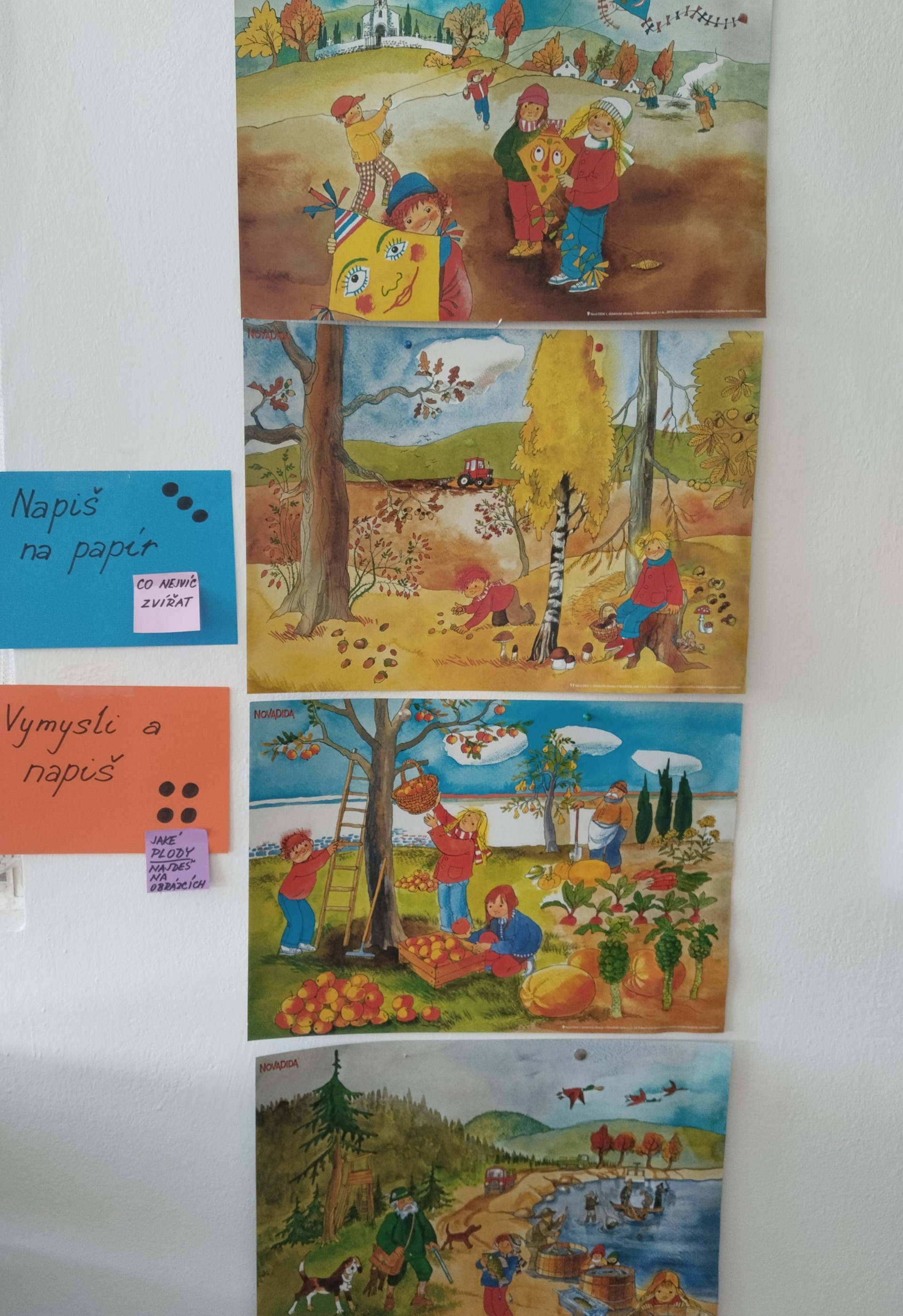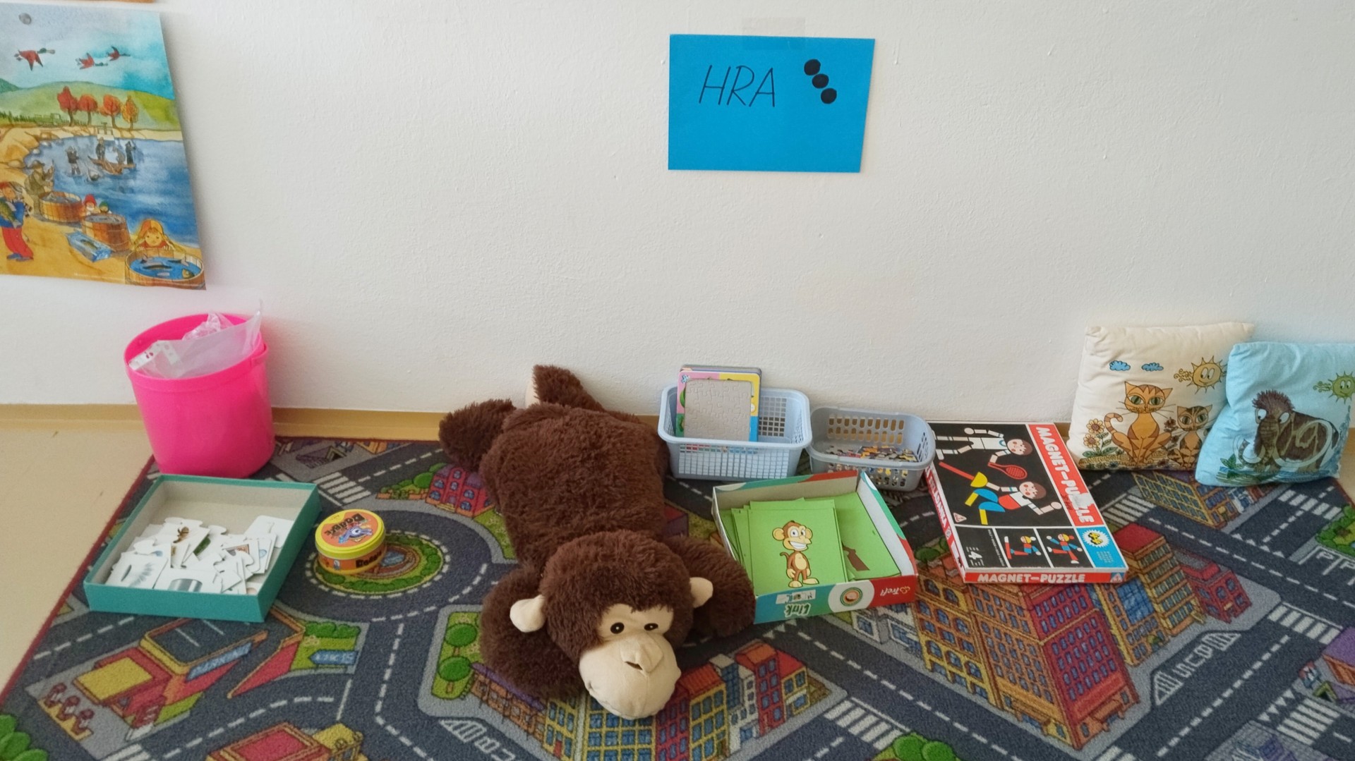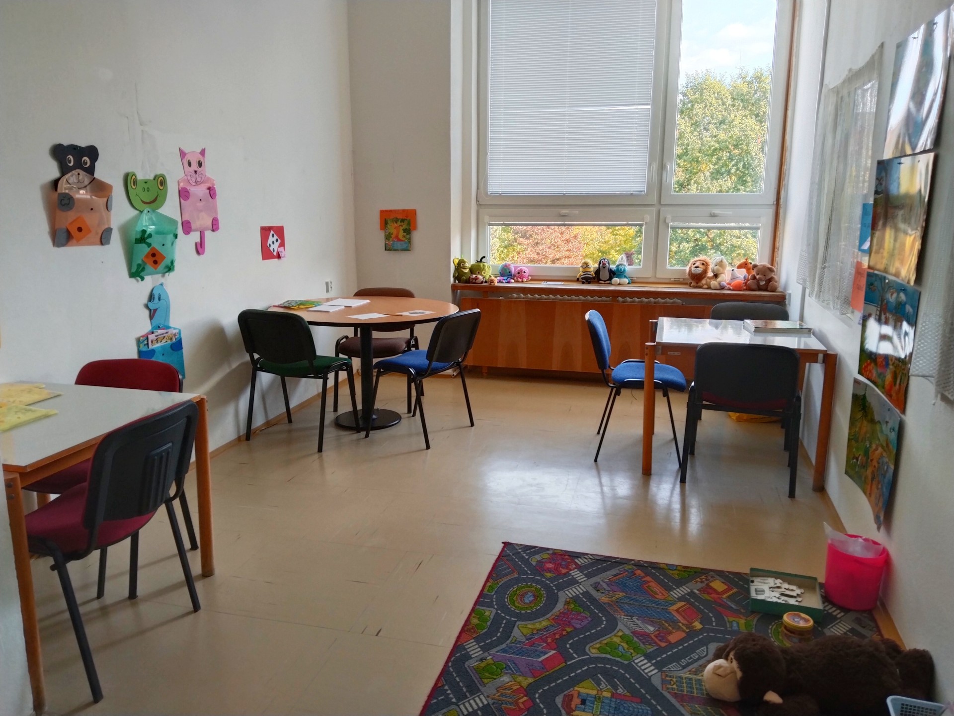Za naší třídou máme ještě jednu místnost,kterou rádi využíváme. Rychlíci, kteří dokončí práci v hodině dřív, si mohou hodit kostkou, a pak si podle počtu puntíků najít úkol. Když se zadaří a padne šestka, znamená to vlastní výběr - může to být hraní hry, kreslení, luštění různých rébusů, ale třeba i jenom odpočinek na koberci :))).