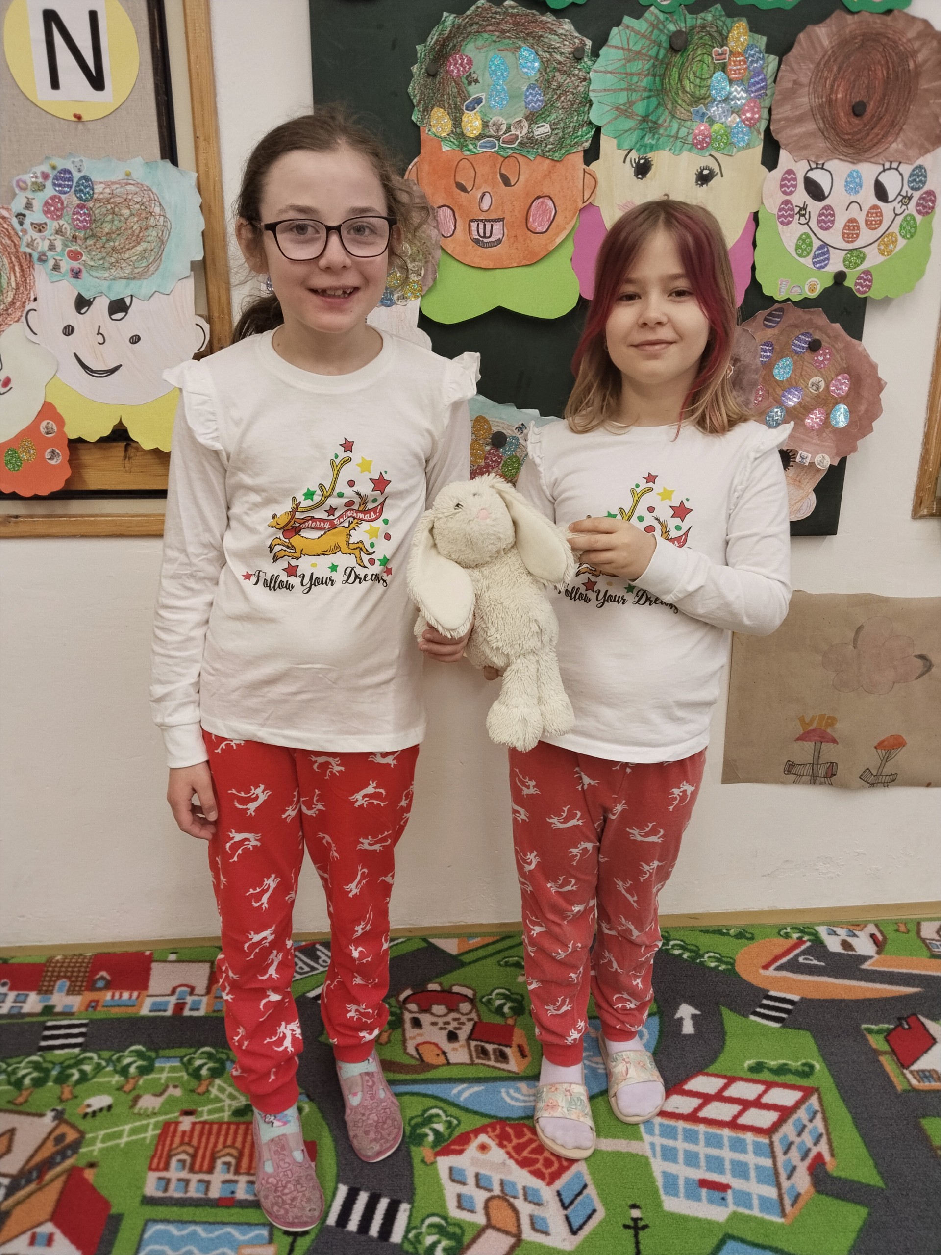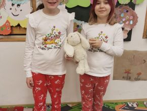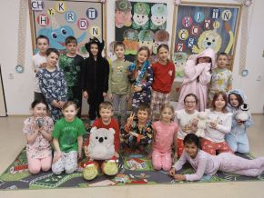 Pondělní dopoledne jsme měli trochu jiné hodiny - při češtině nám jedničky za svou doplňovačku psala Deniska, při matematice se učitelů vystřídalo víc - Lili, Meliska, Jenda, Vláďa a Andrejka. Měli pro nás připravené příklady i slovní úlohy a Vláďa nám ukázal postup na počítání násobilky devíti (využijeme příští rok:)). Při tělocviku vedla rozcvičku Deniska a Meliska. Lili a Sofinka připravily soutěže v družstvech, Vali vymyslela přetahování a Marcelka s Vanesskou házenou. Tohle všechno jsme za hodinu zvládli! Při výtvarce jsme si podle návodu Vanessky vyrobili sešítky. Valerka si připravila šablonky na krásné labutě, které jsme si za jejího dohledu dolepili druhý den. A v úterý nám to moc slušelo v převlecích a ve čtvrtek v pyžamech!
