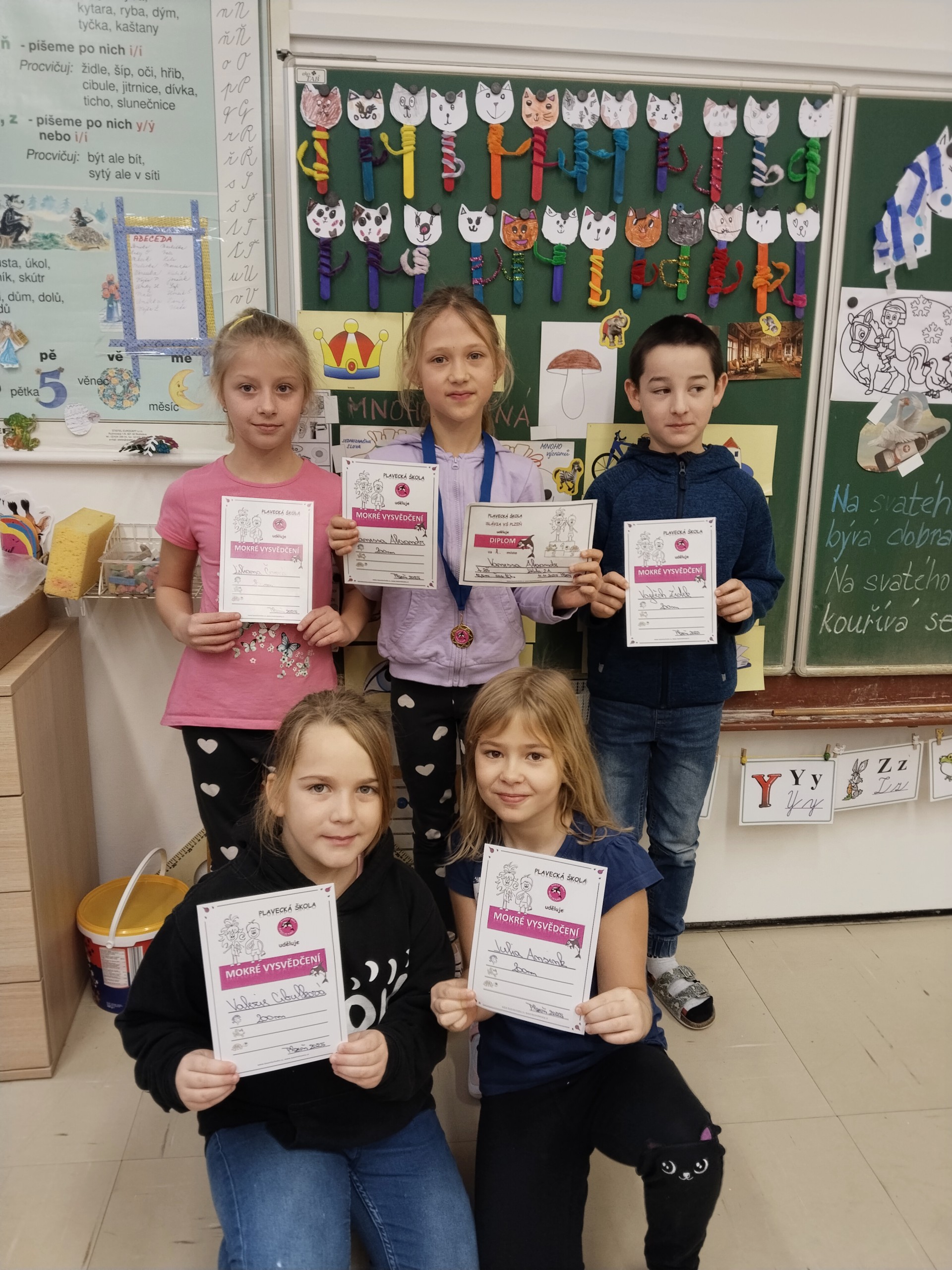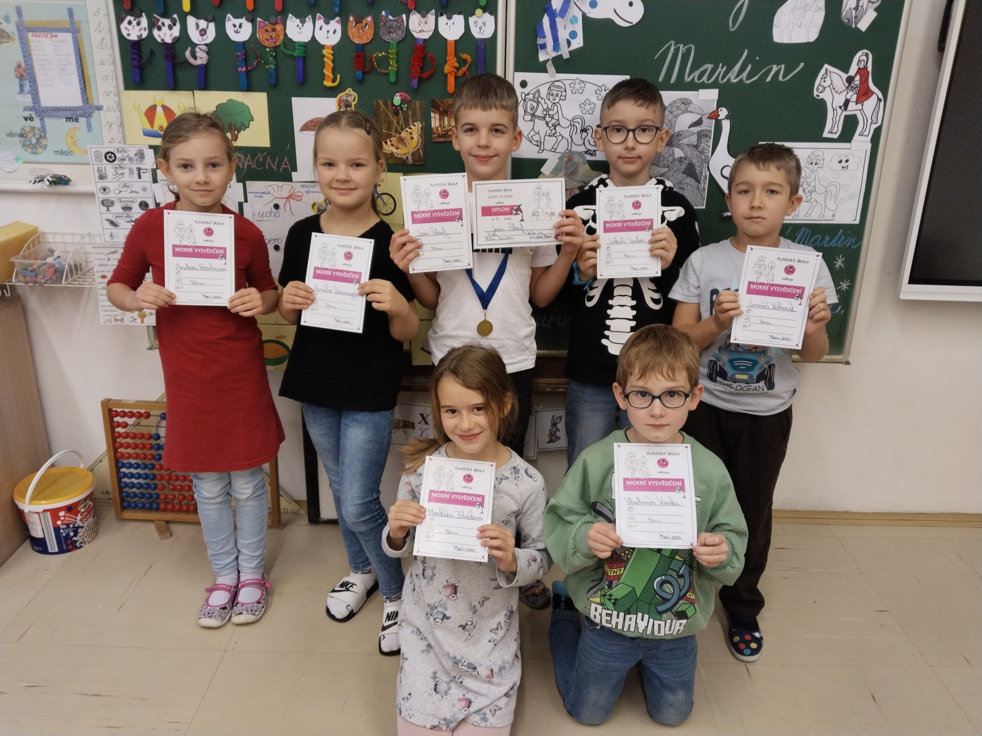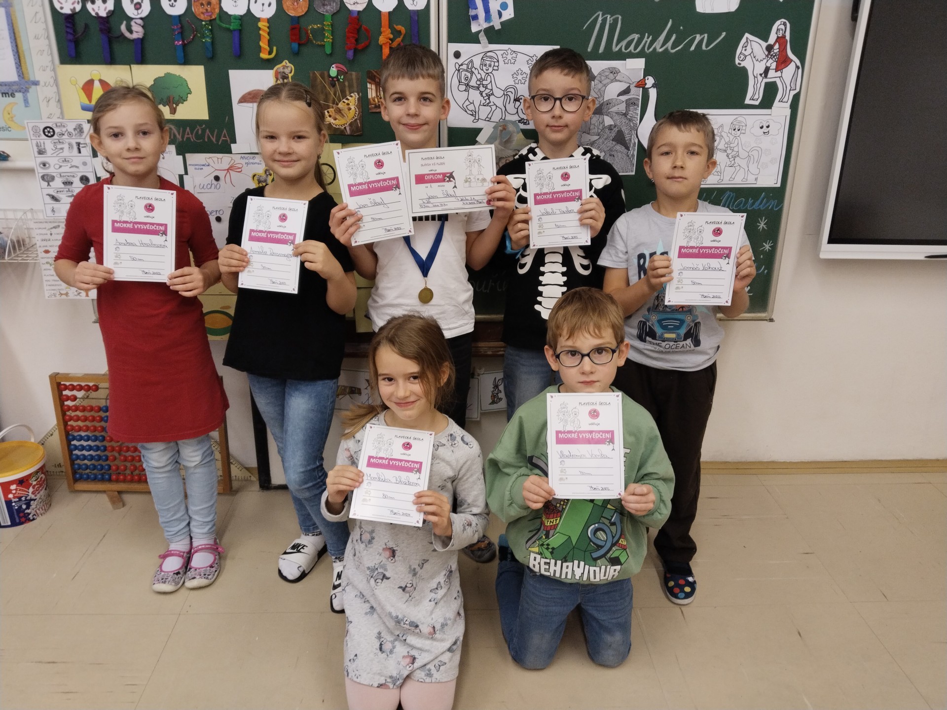V listopadu jsme ukončili tříměsíční blok plaveckého výcviku. Při poslední lekci jsme dostali mokré vysvědčení a zazávodili si v rychlosti. Někteří si odnášeli vysvědčení s delfínem, někteří s kapříkem a nebo s želvou. Vítězové závodu dostali navíc diplomy a dokonce i medaile! Ale všichni, kteří se snažili, zaslouží velkou pochvalu.