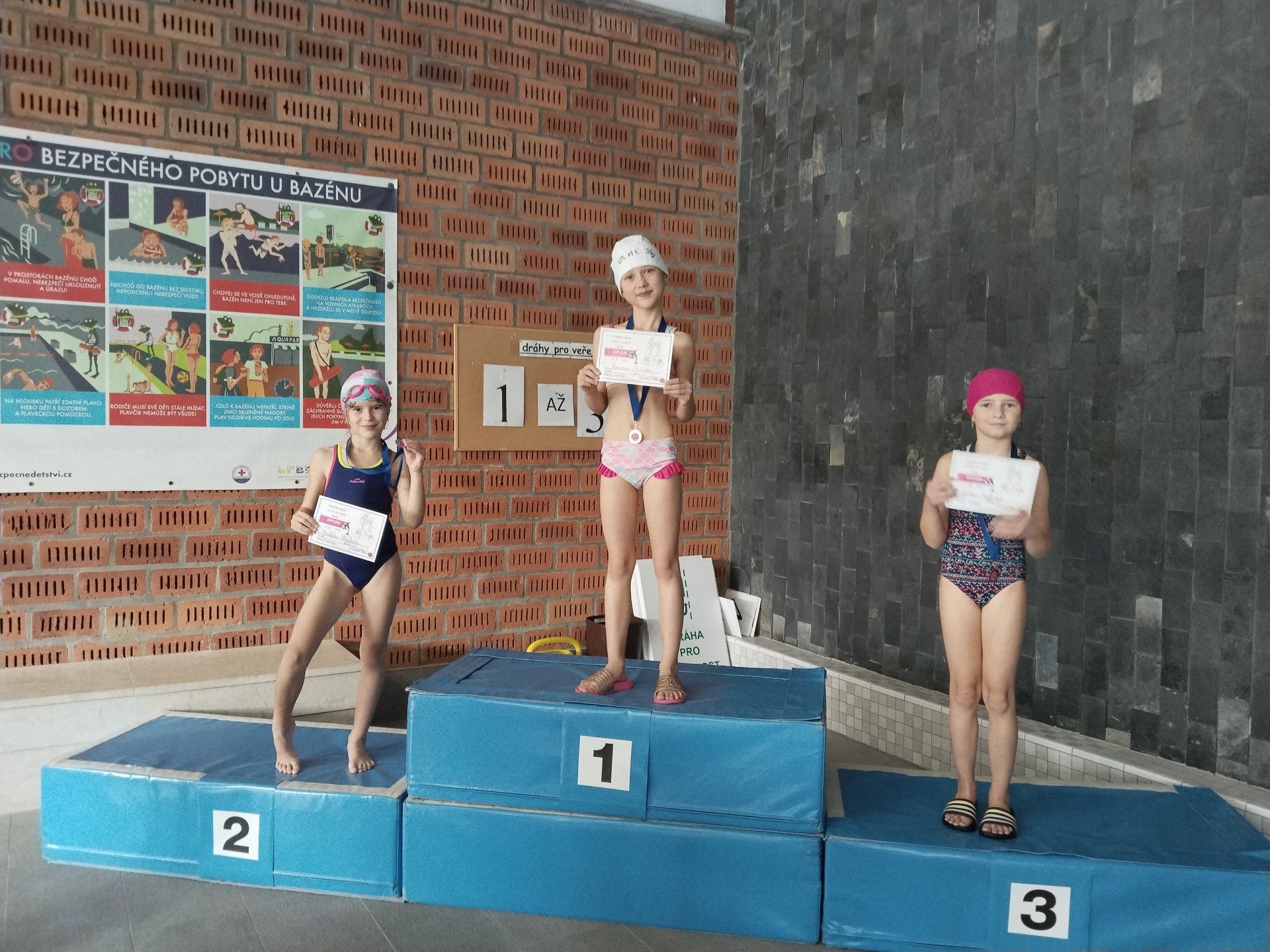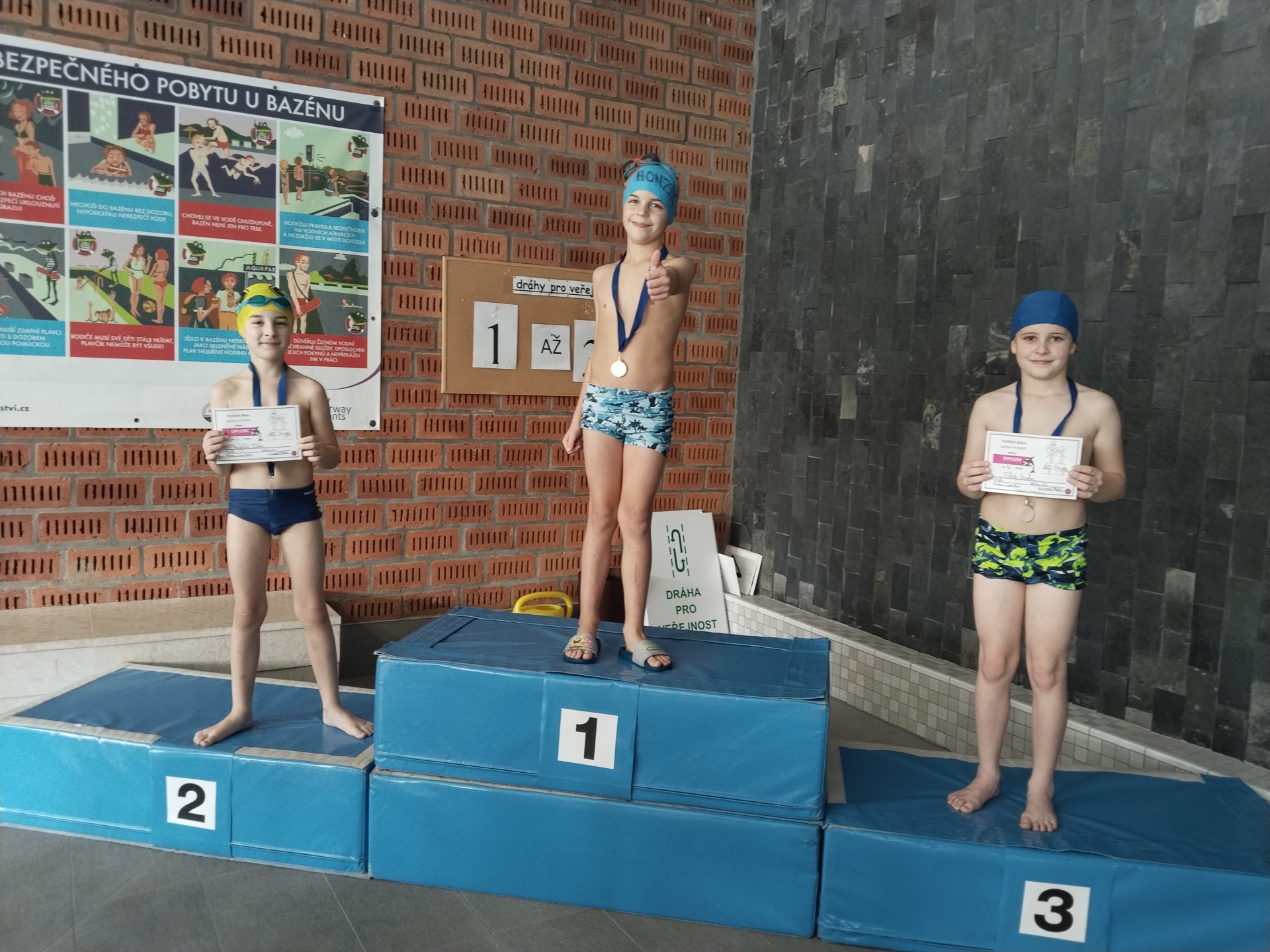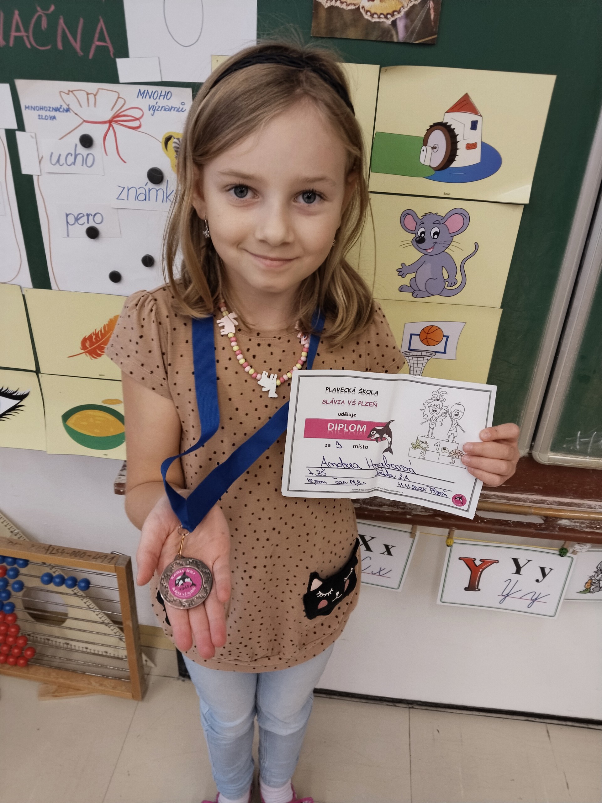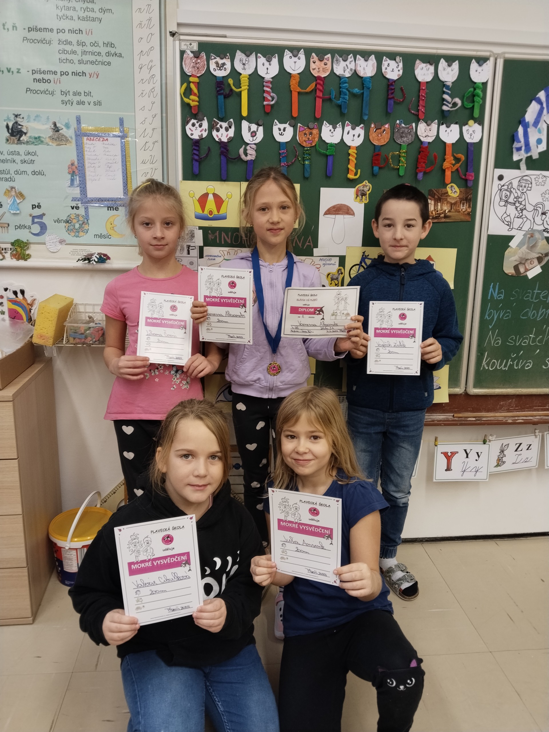 V listopadu jsme ukončili tříměsíční blok plaveckého výcviku. Při poslední lekci jsme dostali mokré vysvědčení a zazávodili si v rychlosti. Někteří si odnášeli vysvědčení s delfínem, někteří s kapříkem a nebo s želvou. Vítězové závodu dostali navíc diplomy a dokonce i medaile! Ale všichni, kteří se snažili, zaslouží velkou pochvalu.