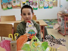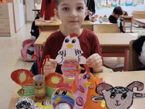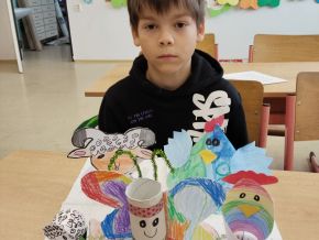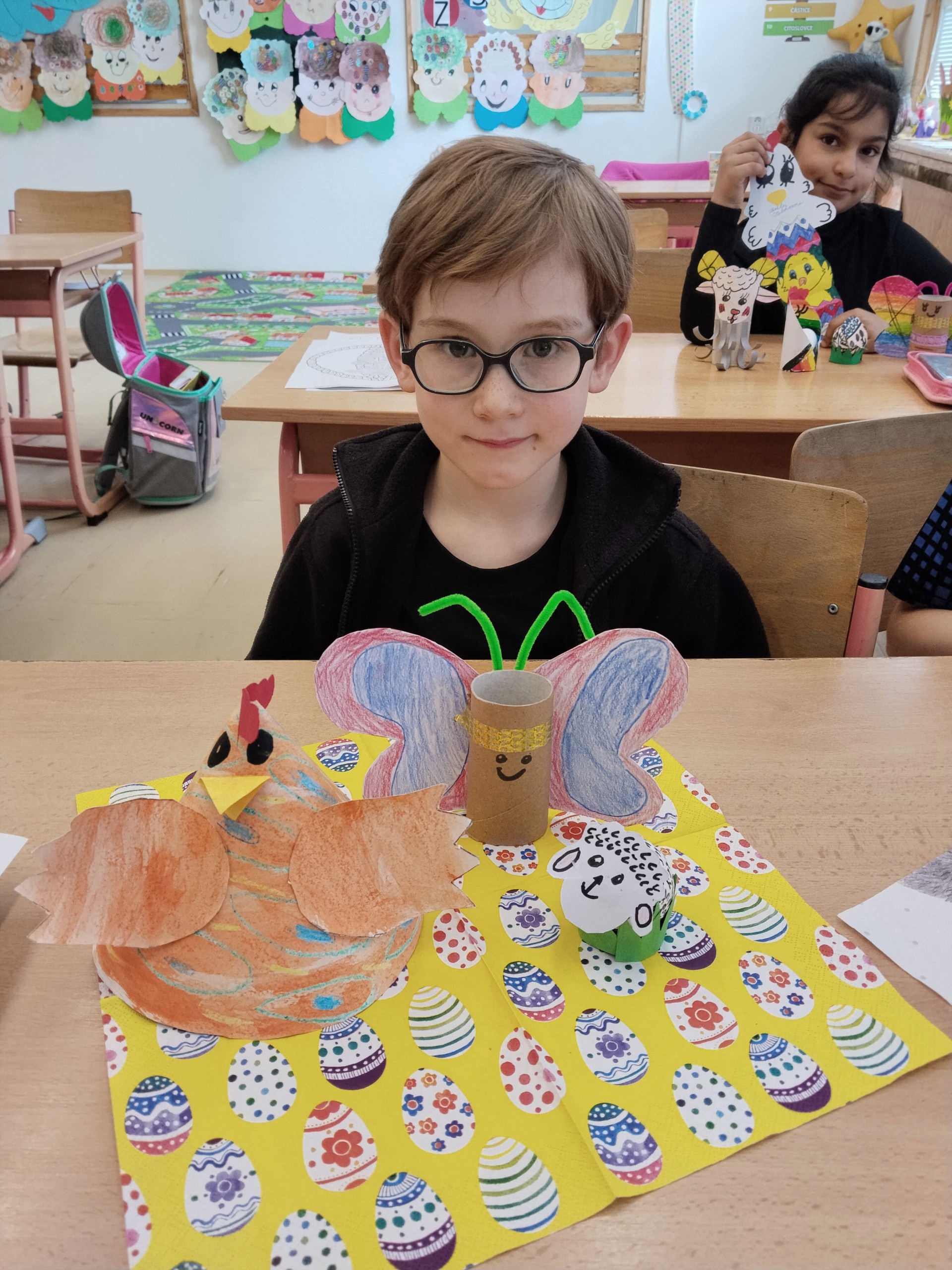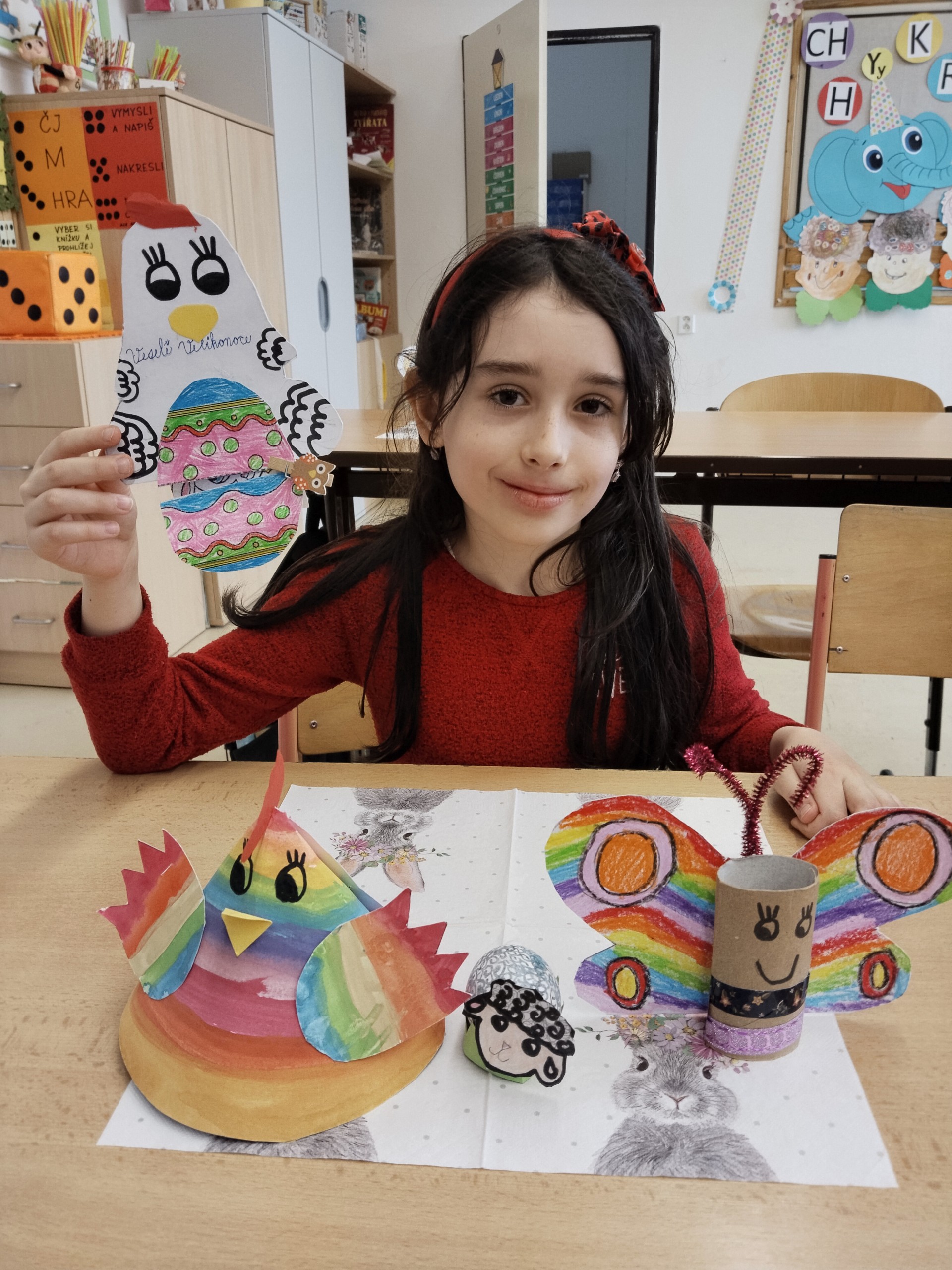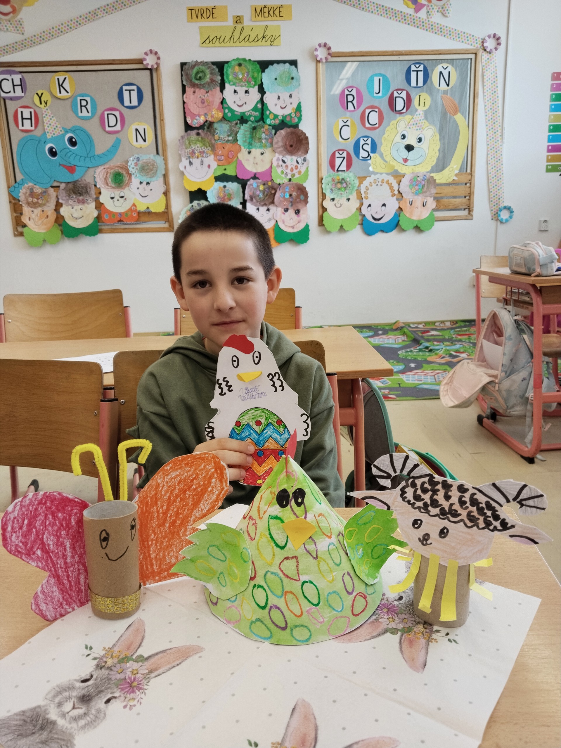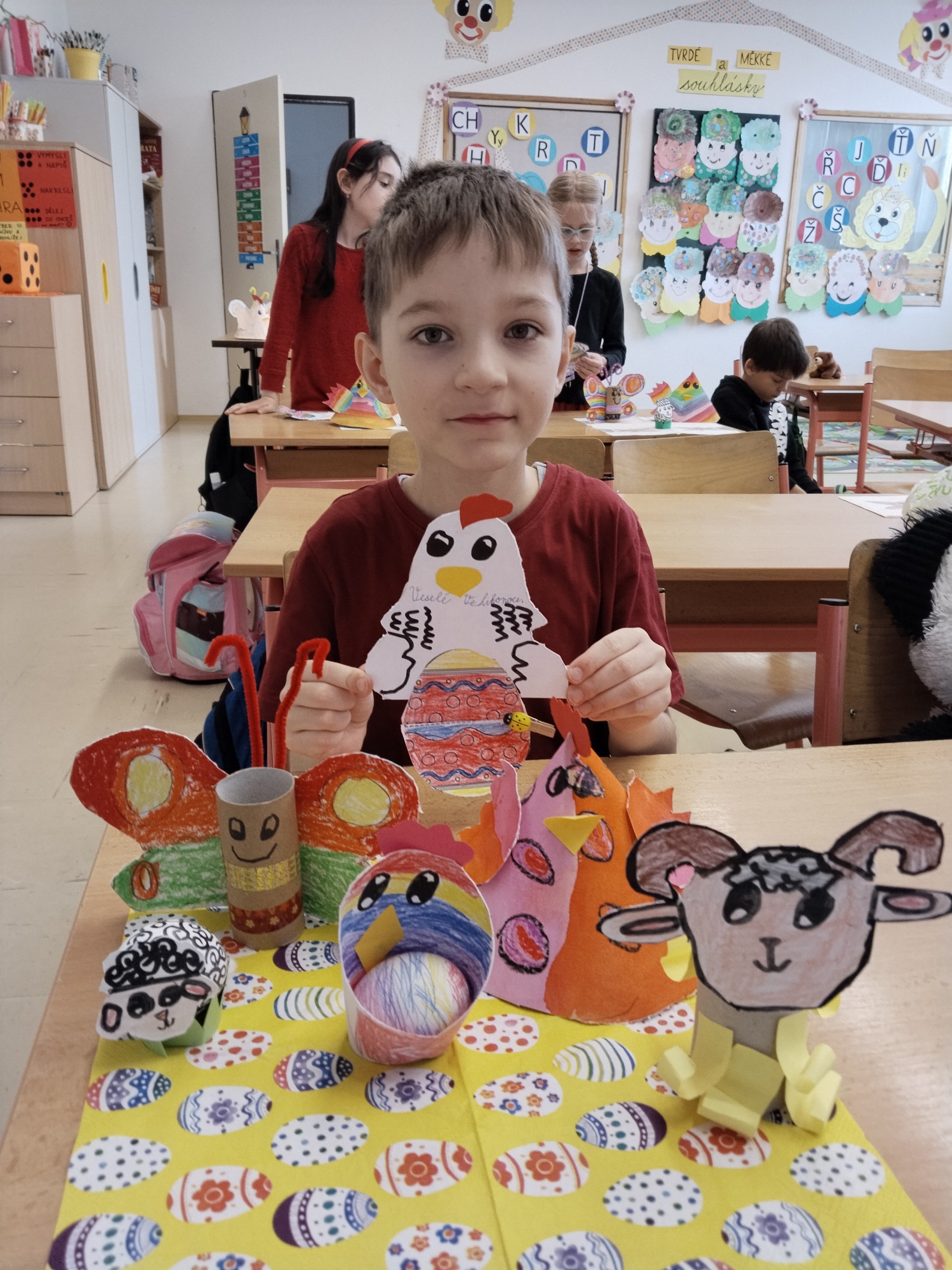 Středeční dopoledne bylo celé soutěžní a hlavně předvelikonoční. Místo matematiky jsme počítali příklady pro ,,slepičí " týmy a sestavovali kurníky. Pak jsme řešili vajíčkové úlohy - za každou správně vypočítanou jsme dostali jedno vajíčko do košíku. Po matematice přišla češtinářská ,,běhačka". Pátrali jsme po pukavcích, kteří se připletli mezi správně napsaná vajíčka. Za vyluštění tajenky jsme dostali jedničku s vajíčkem :))). Nakonec jsme si popovídali o tradicích, které k Velikonocům patří a dostali za své snažení odměny. Děkujeme Andrejce Ouředníkové, která pro všechny děti přinesla sladké překvapení.