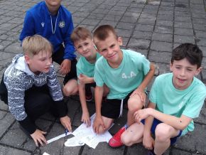 Ve středu jsme pokračovali v našem olympijském závodění. Nejprve jsme sbírali po areálu lístečky s informacemi o olympiádě, ke kterým nás naši ,,němí" kapitáni museli navigovat pomocí pantomimy a námi vytvořených mapek. Když jsme nasbírali všechen ,,studijní materiál", bylo třeba si informace přečíst a zapamatovat, protože po svačině soutěž pokračovala a kdo víc věděl, ten byl úspěšnější. Odpovědi jsme zapisovali na naše olympijské maskoty, kteří v případě, že někdo neznal odpověď, mohli jako jediní z družstva napovídat a poradit. Po obědě a poledním odpočinku jsme vyrazili kolem Rudolfova kamene do Horažďovic. Večer proběhlo slavnostní vyhlášení vítězů dopolední soutěže - i s nástupem při olympijské hymně.