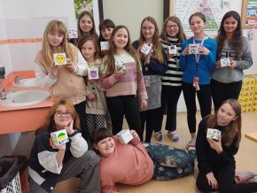 V rámci pracovní výchovy jsme si narýsovali síť krychle. Vyrobili jsme si házecí kostku.